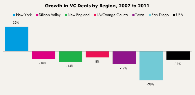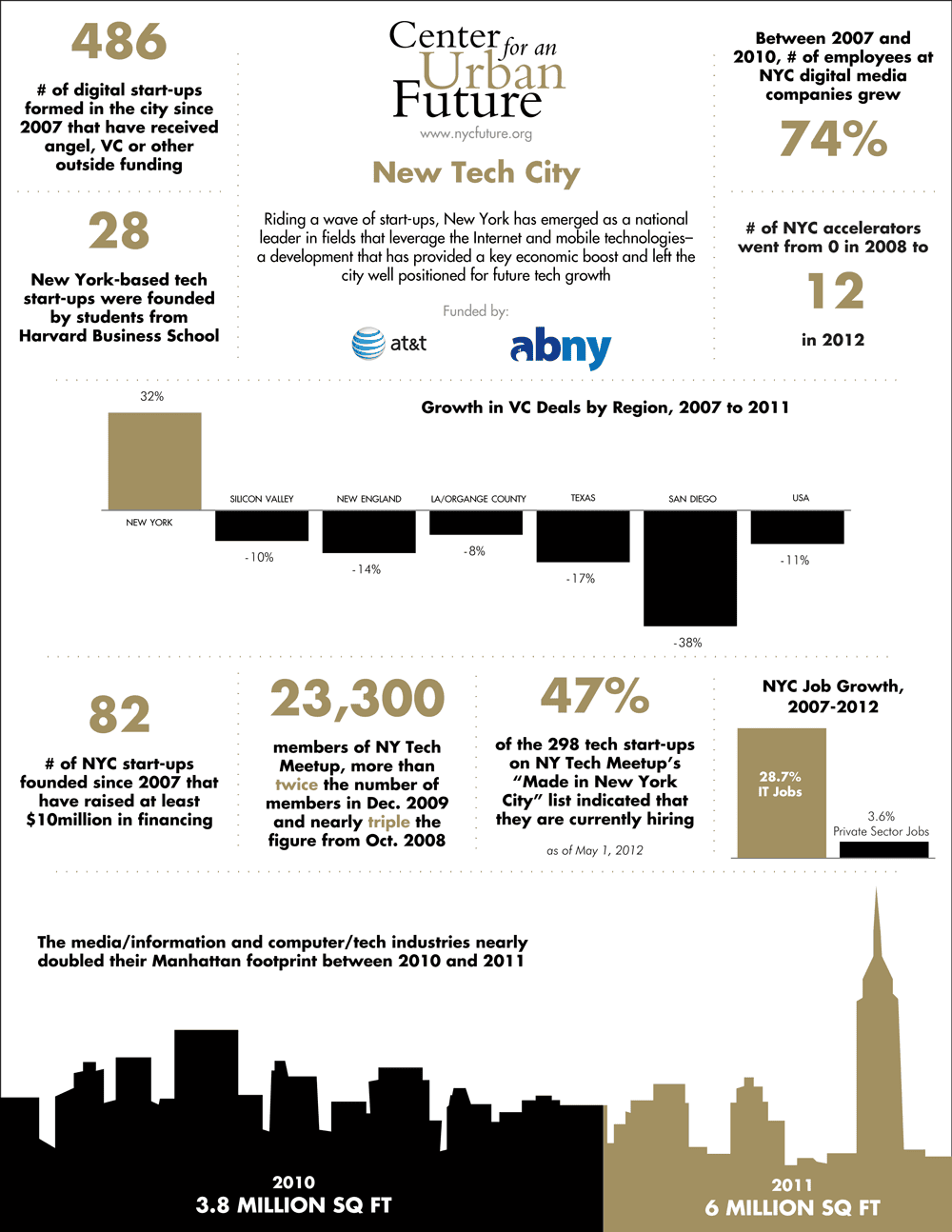 What’s clear from our research is that New York City’s tech sector has come a long way in the last few years. A decade after the bust of the dot com bubble left most serious venture capitalists and entrepreneurs highly skeptical that New York could ever become a major hub of tech activity, the city has produced a wave of wildly successful start-ups, attracted entrepreneurs that previously would have almost certainly bypassed New York for Boston and the West Coast, and positioned itself at the vanguard of the fast-growing digital media, Internet and social networking sectors.
