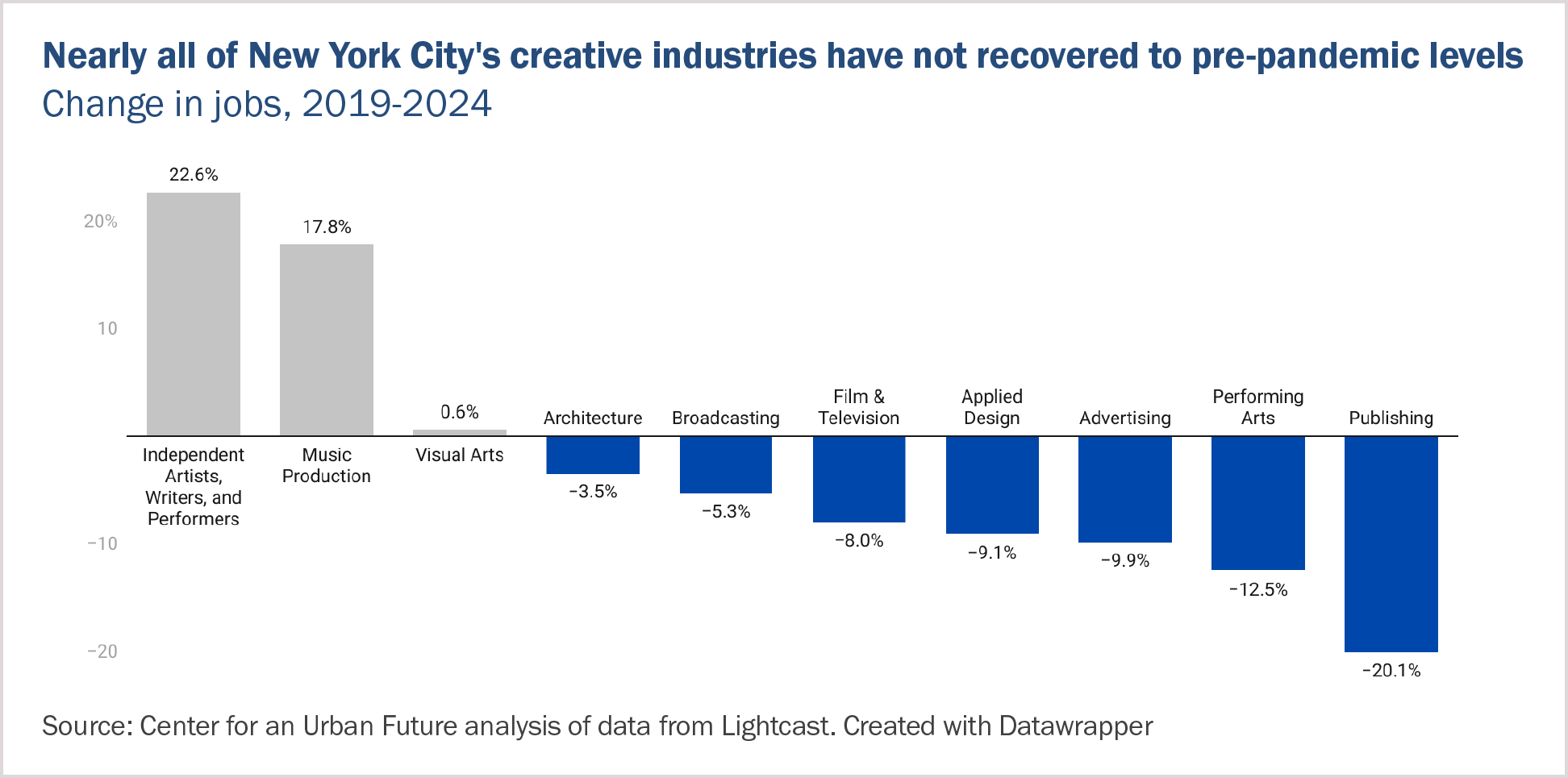 New York City’s creative industries are also at risk New York’s for-profit creative sectors—film and television, advertising, design, fashion, architecture, and more—have been hit hard by pandemic-era disruptions and are now grappling with deeper structural shifts. While jobs have partly rebounded, many industries remain under severe strain as costs rise, technologies evolve, and competition intensifies.