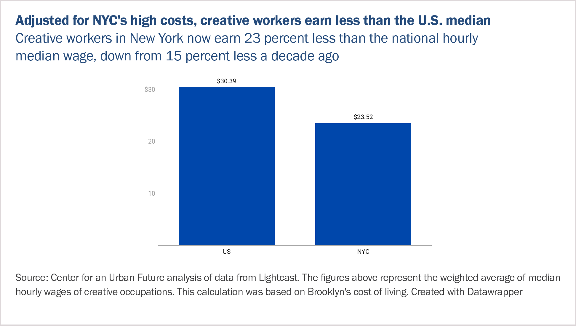 The causes run deeper than the pandemic. New York’s broader affordability crisis—already pushing out thousands of working- and middle-class residents—is hitting the creative sector especially hard. While artists have long struggled to afford life in New York, today those pressures extend across the entire creative economy, squeezing professionals in fields like advertising, design, and fashion. Creative workers in New York now earn about 23 percent less than the national average after adjusting for the city’s high cost of living, down from 15 percent less a decade ago, while housing and studio rents continue to climb.