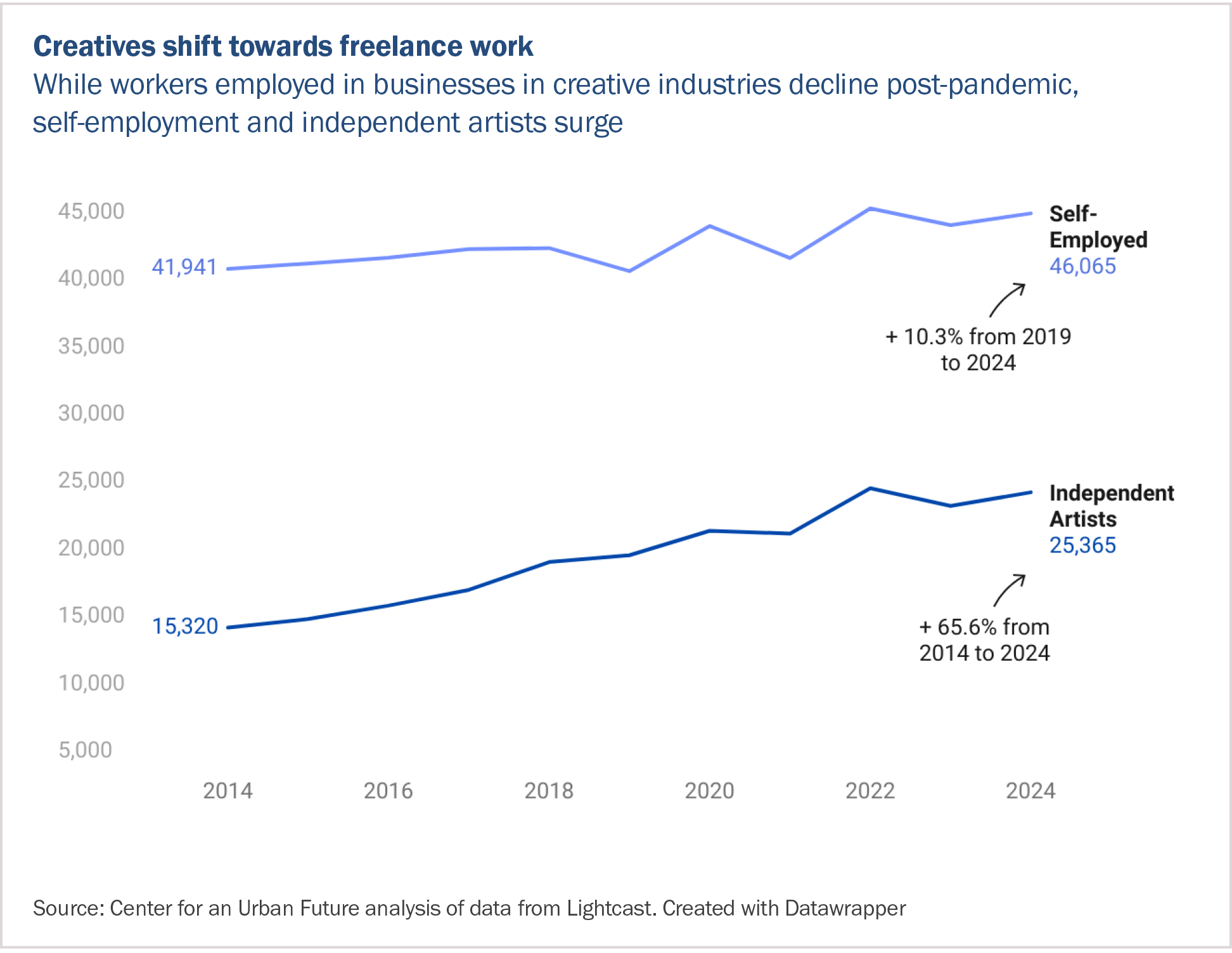 It’s no coincidence that one of the only creative industries to grow since 2019 is independent artists, up 22.6 percent. That growth reflects the rise of freelance and self-employed creative workers—a shift that has brought greater flexibility but also deepened challenges around financial stability, health insurance, and other essential benefits.