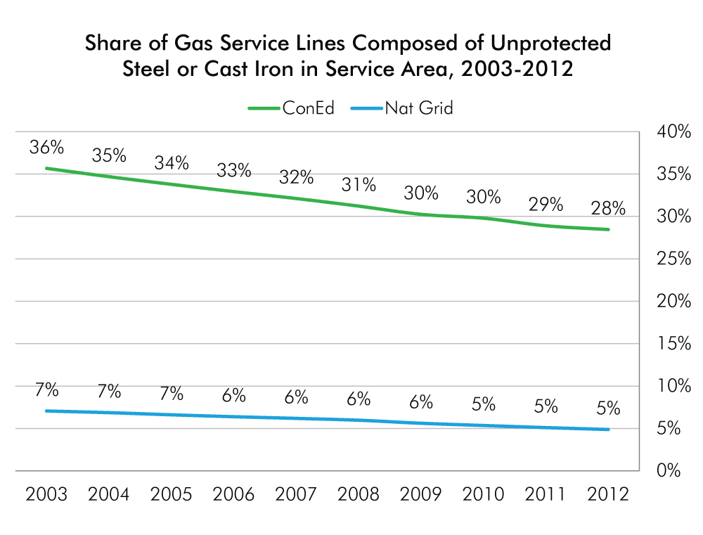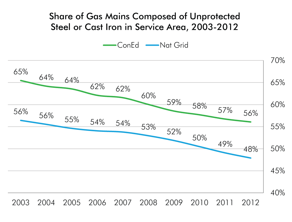 The decline in leaks is prompted not by happenstance, of course, but a consistent—if still insufficient—effort to replace old and vulnerable pipes by both Con Edison and National Grid. Unprotected steel and cast iron lines, identified as leak prone materials by the federal Pipeline and Hazardous Materials Safety Administration, have been singled out for removal. From 2003 to 2012, the share of gas mains composed of these materials fell from 61 percent to 52 percent and the share of service lines fell from 19 percent to 14 percent. As a result, the number of leaks credited specifically to corrosion fell even faster than the overall leak rate, from 6,265 to 3,947, a 37 percent drop.