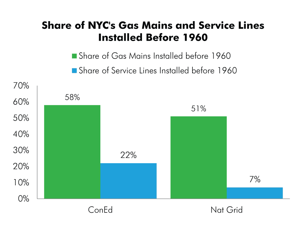 As documented in our Caution Ahead report last year, New York City’s gas infrastructure is indeed old. Of the 6,400 miles of main running beneath our streets, 53 percent were installed prior to 1960. These mains distribute gas to New York’s businesses and residences via service lines, connected to nearly every building in the city. It is these lines, whether due to corrosion or improper installation, where dangerous gas leaks most often originate. Of the 814,892 services in the city, 93,187 are over 55 years old.