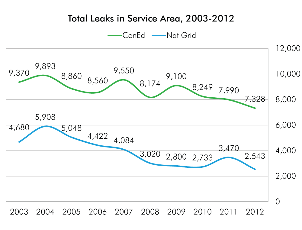 Though gas leaks remain a daily occurrence in New York, the city’s providers—Con Edison and National Grid—have significantly improved the safety and efficiency of the distribution system in recent years. In 2003, there were 14,050 leaks across their respective service areas (which, for Con Edison, includes Westchester). By 2012, the number of leaks fell to 9,871, a 30 percent drop.