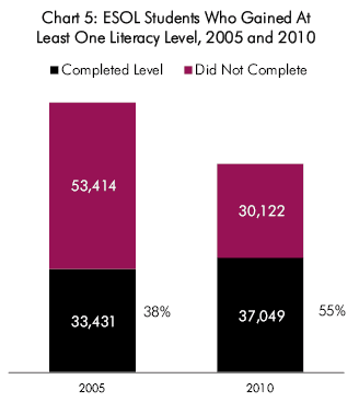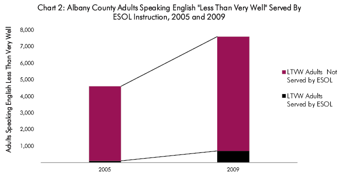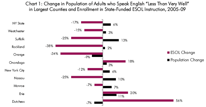 Selected charts and graphs from the Center for an Urban Future's January 2012 policy brief which found that communities from Albany and Syracuse to Queens and Staten Island are experiencing an influx of immigrants, many of whom lack English proficiency—but the number of state-funded ESOL classes has declined in recent years.