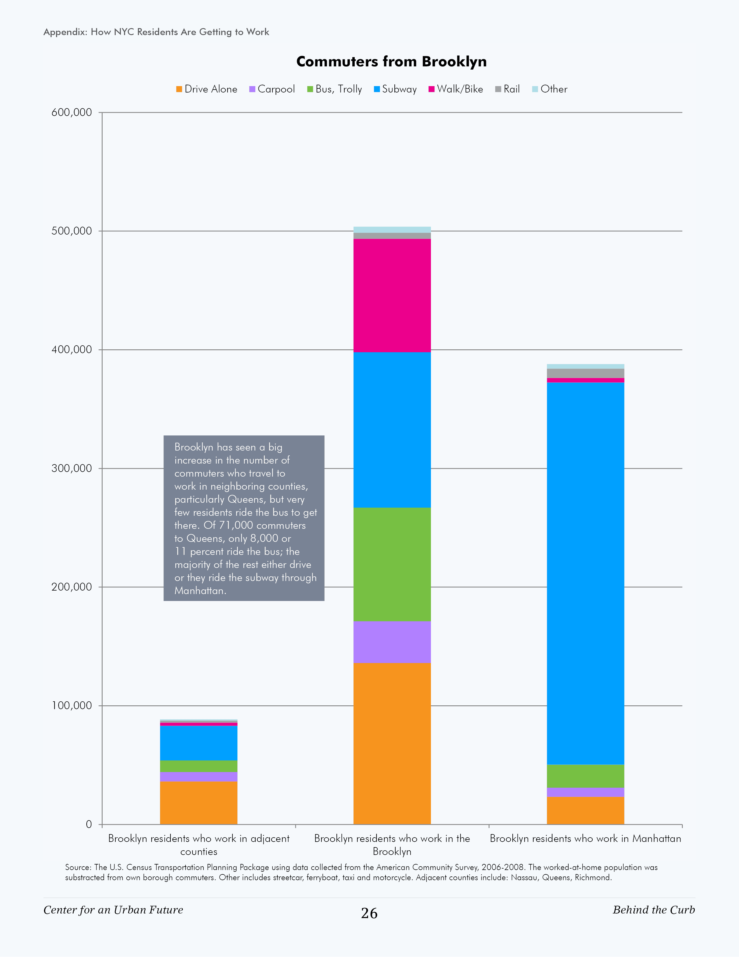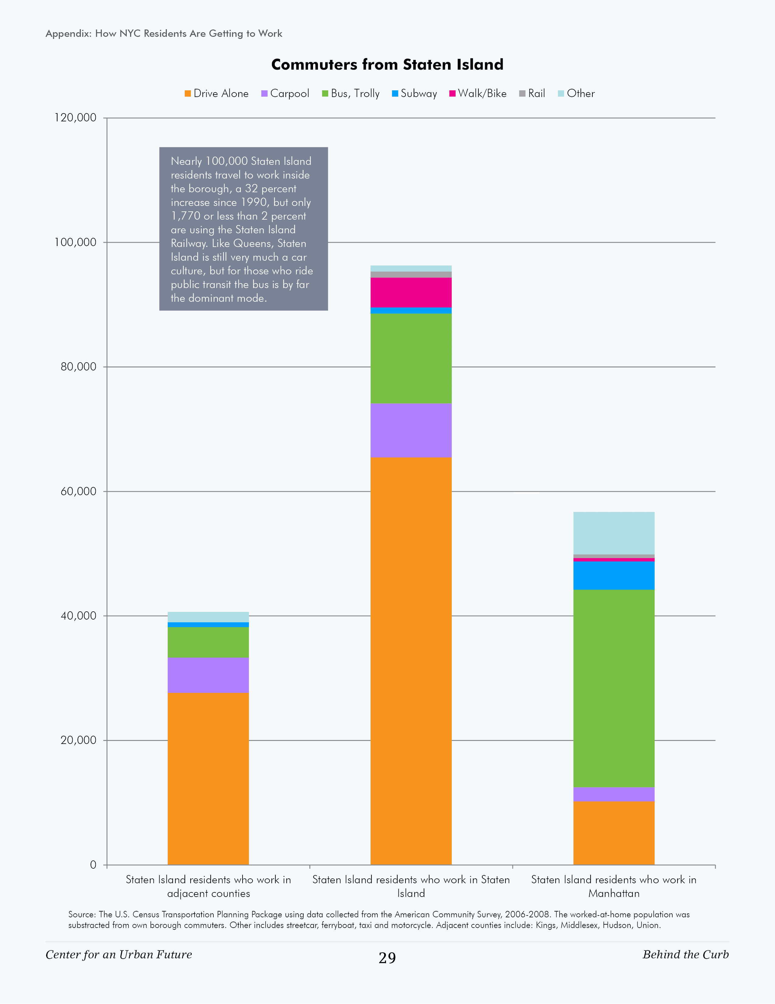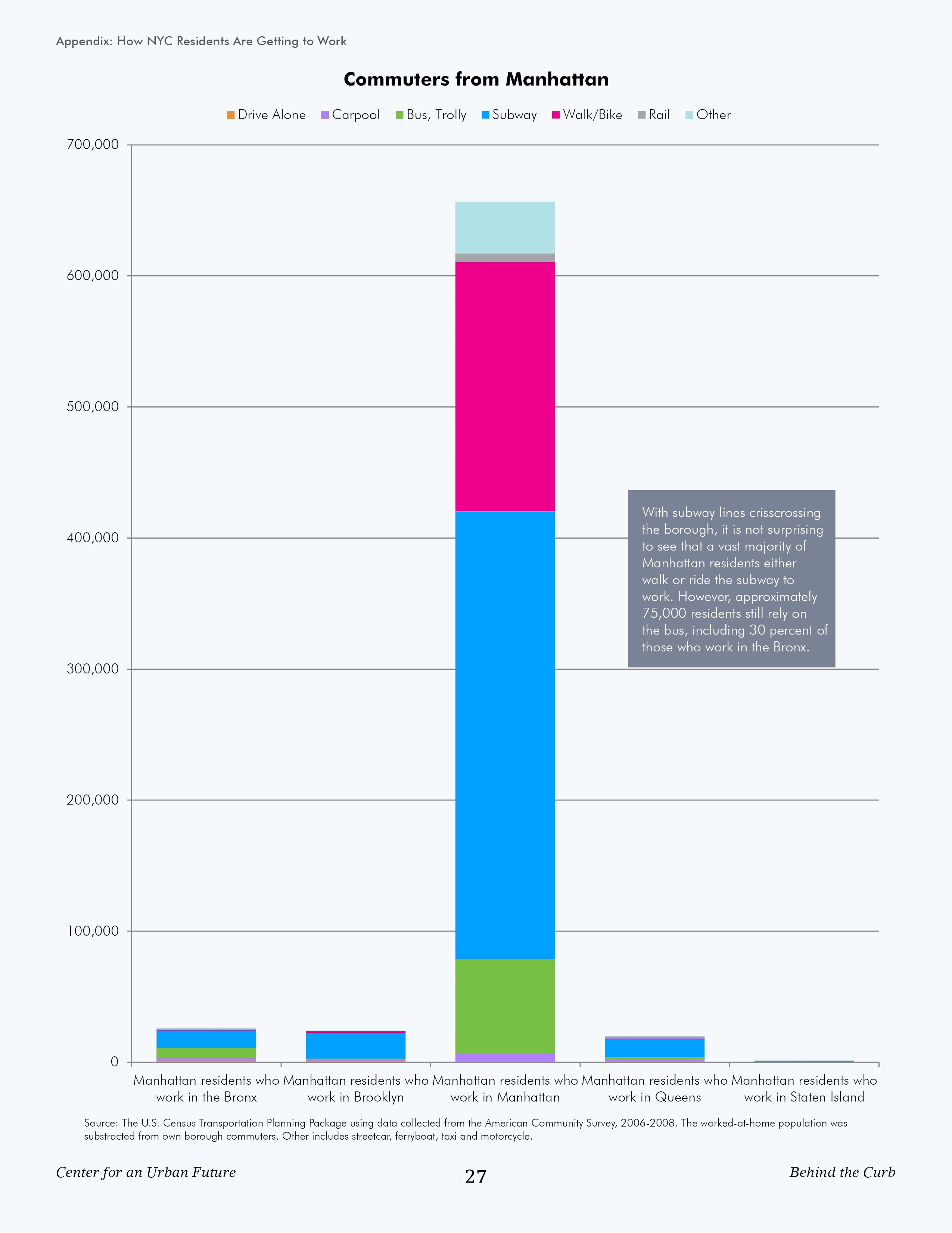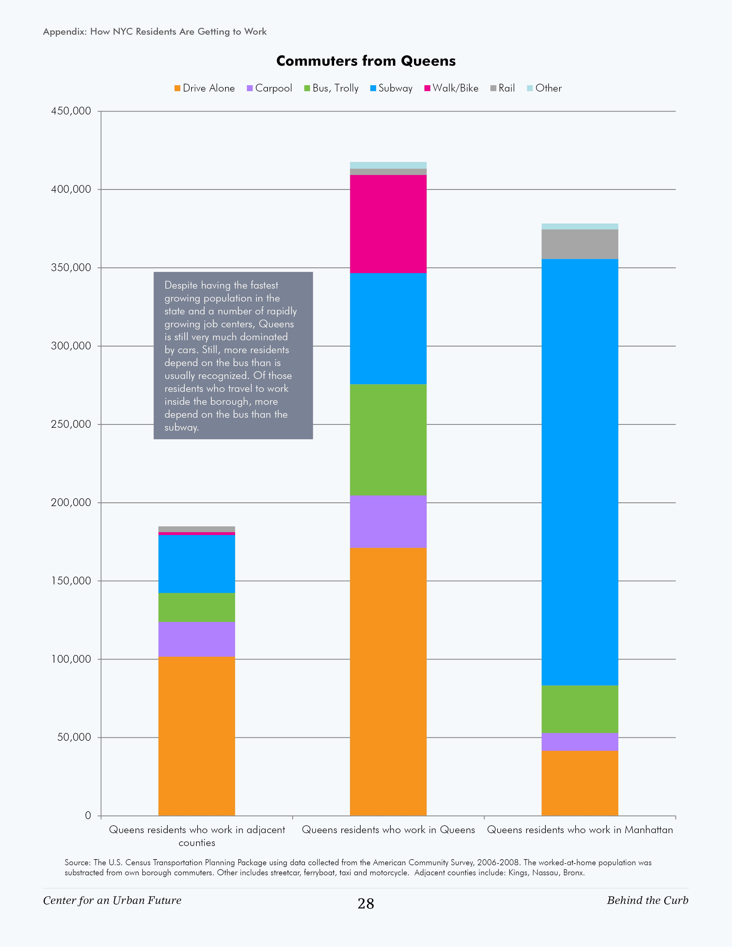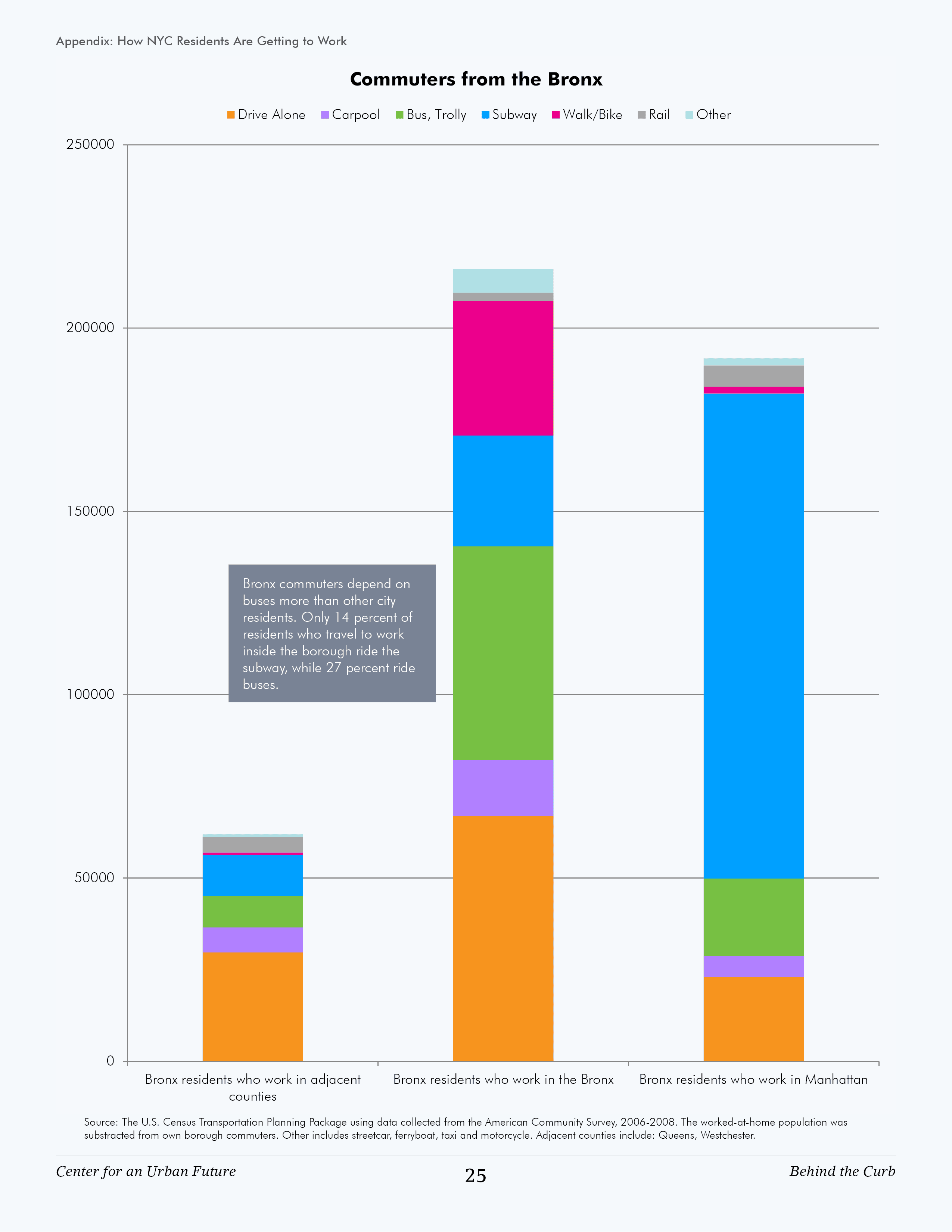 Selected charts and graphs from the Center for an Urban Future's major February 2011 report which found that a disproportionate share of the city's recent job growth, transit ridership gains and population growth have occurred in the four boroughs outside of Manhattan. However, transit service in the boroughs has not kept pace-and the biggest losers have been the city's working poor.