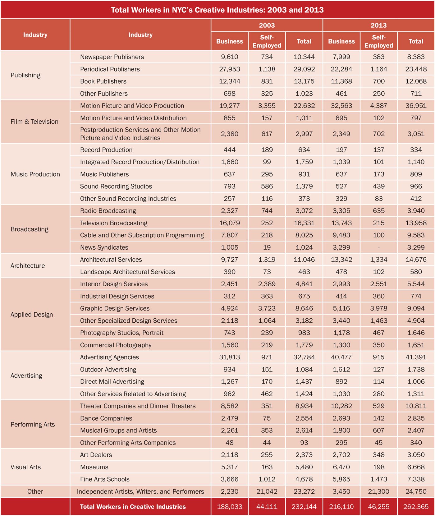Charts and tables from our 2015 Creative New York study. The report found that the creative sector is one of New York City’s most important economic assets but that the city’s working artists, nonprofit arts groups and for-profit creative firms face a growing number of challenges.