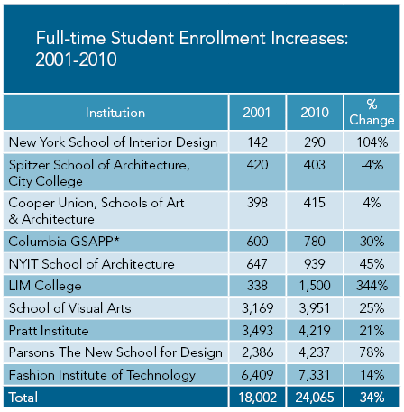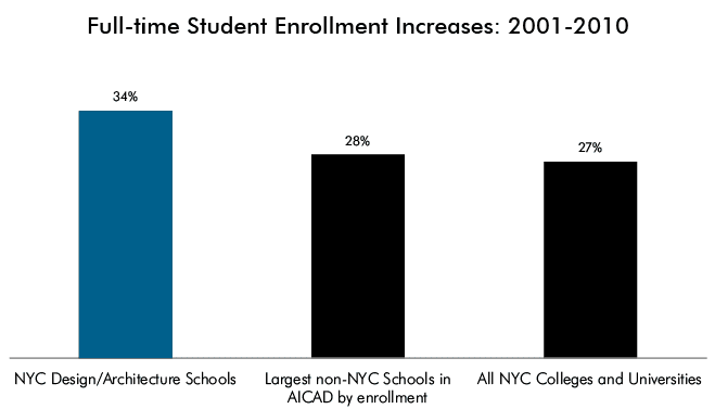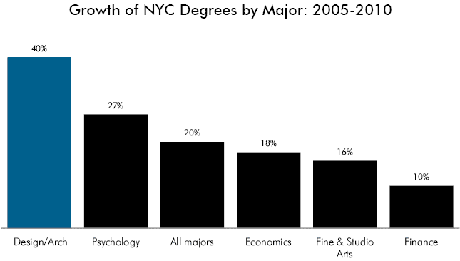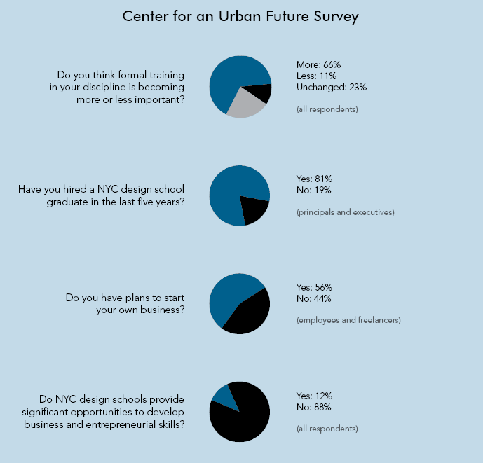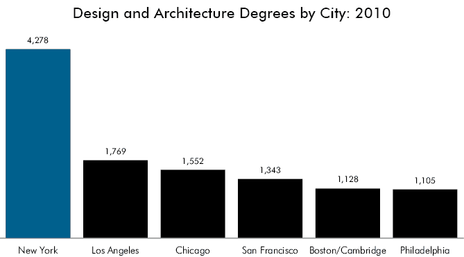 Selected charts and graphs from the Center for an Urban Future's March 2012 report on NYC's design schools. The report found that New York City graduates twice as many students in design and architecture as any other U.S. city, but the city's design schools are not only providing the talent pipeline for New York's creative industries—they have become critical catalysts for innovation, entrepreneurship and economic growth.
