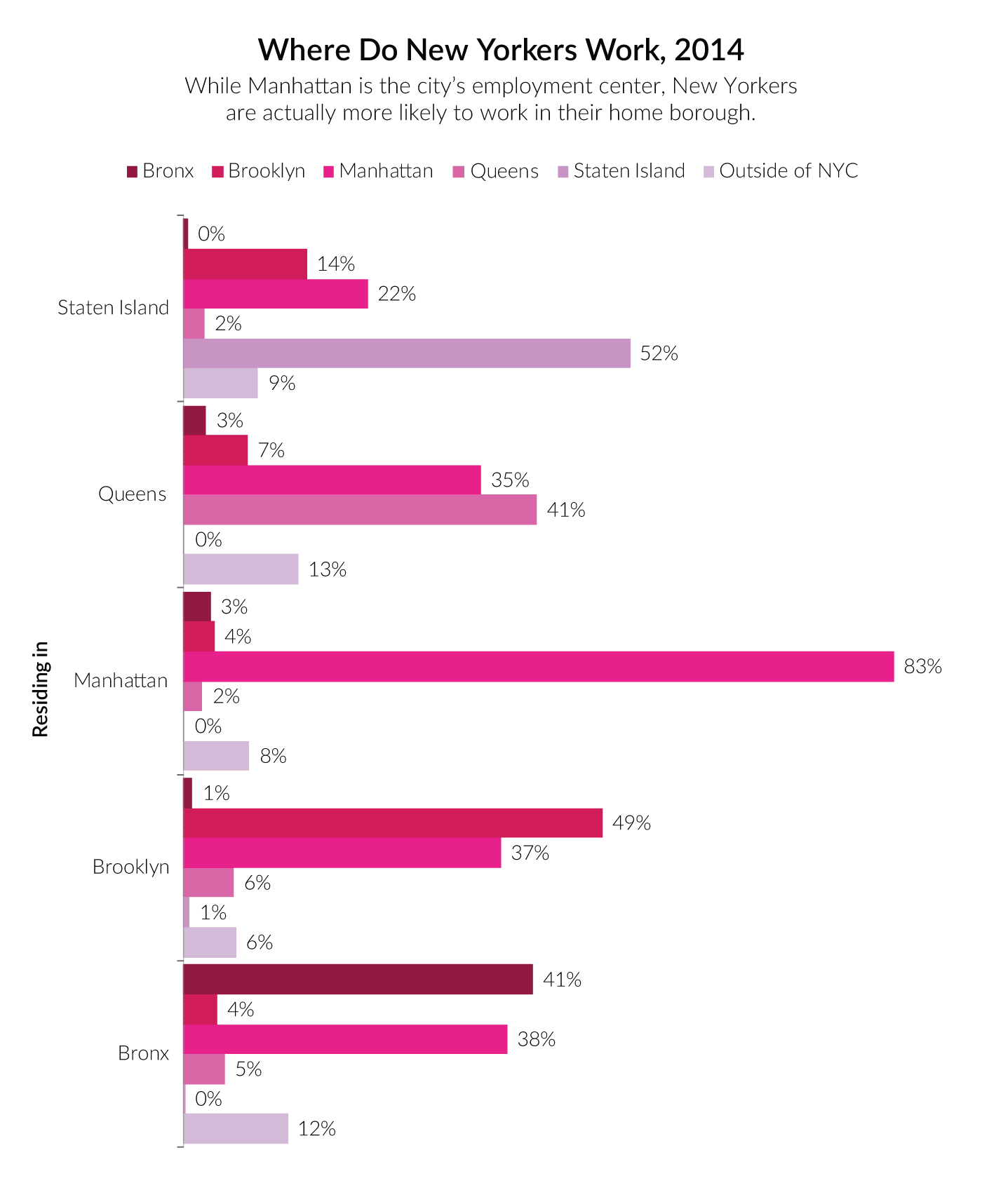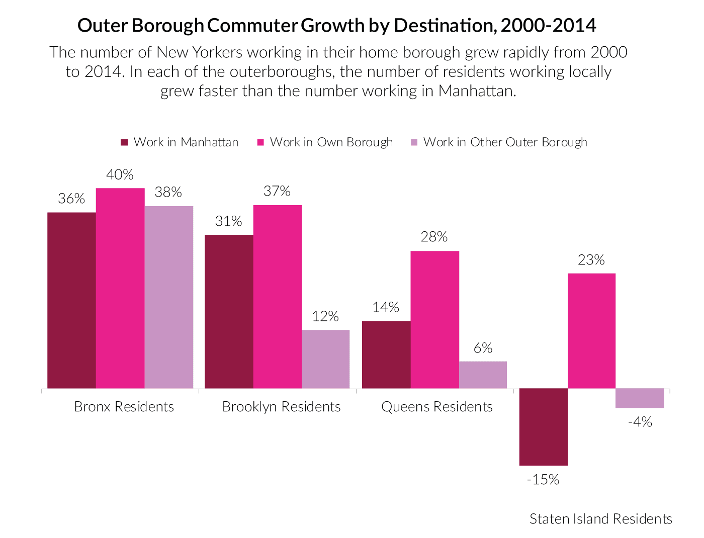 From 2000 to 2014, the number of New Yorkers working in their home borough increased by 40 percent in the Bronx (from 168,849 to 237,156), 37 percent in Brooklyn (from 431,243 to 591,487), 28 percent in Queens (from 363,822 to 465,506), 23 percent in Staten Island (from 87,259 to 107,542) and 18 percent in Manhattan (from 635,122 to 747,996).