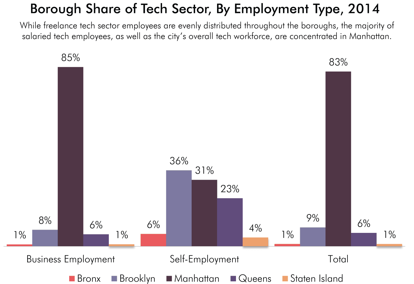 Manhattan is home to 83 percent of all tech sector jobs in the city. Brooklyn has the second largest share (9 percent), followed by Queens (6 percent), the Bronx (1 percent) and Staten Island (1 percent).
