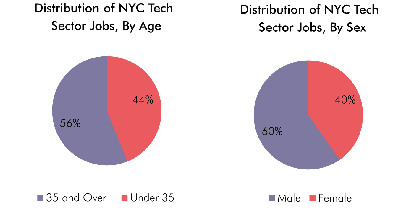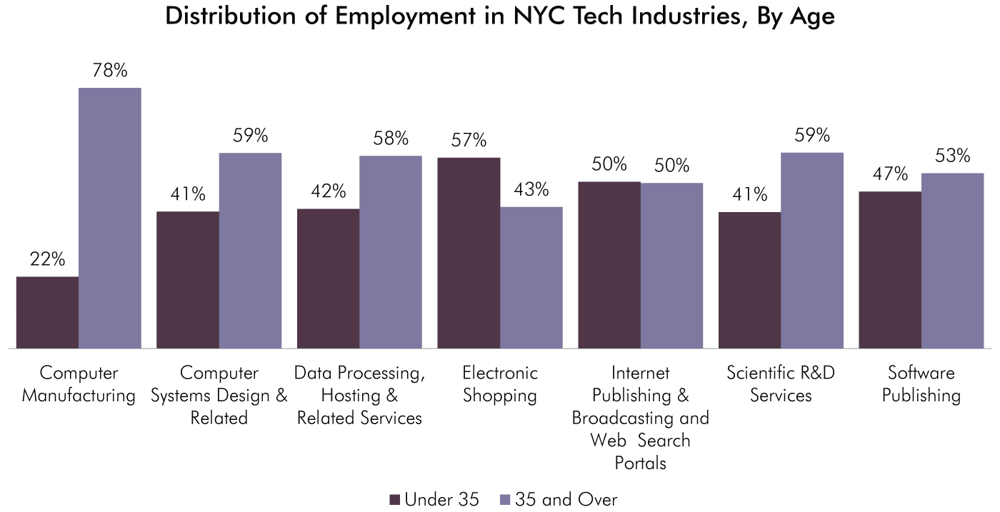 44 percent of employees in the city’s tech sector are under the age of 35. While workers under the age of 35 comprise only 22 percent of those working in the Computer Manufacturing subsector, these young workers make up 57 percent of the workforce in Electronic Shopping, 50 percent in Internet Publishing & Web Search Portals and 47 percent in Software Publishing.
