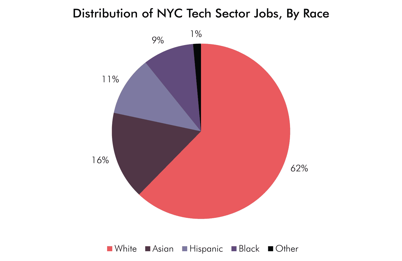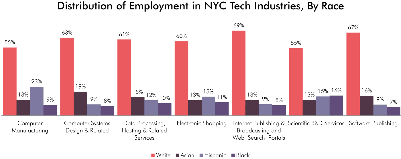 62 percent of tech sector employees are white, 16 percent Asian, 11 percent Hispanic and 9 percent African American. The largest shares of white employees are in Internet Publishing & Web Search Portals (69 percent), Software Publishing (67 percent) and Computer Systems Design (63 percent). The lowest shares are in Computer Manufacturing (55 percent) and Scientific R&D Services (55 percent).