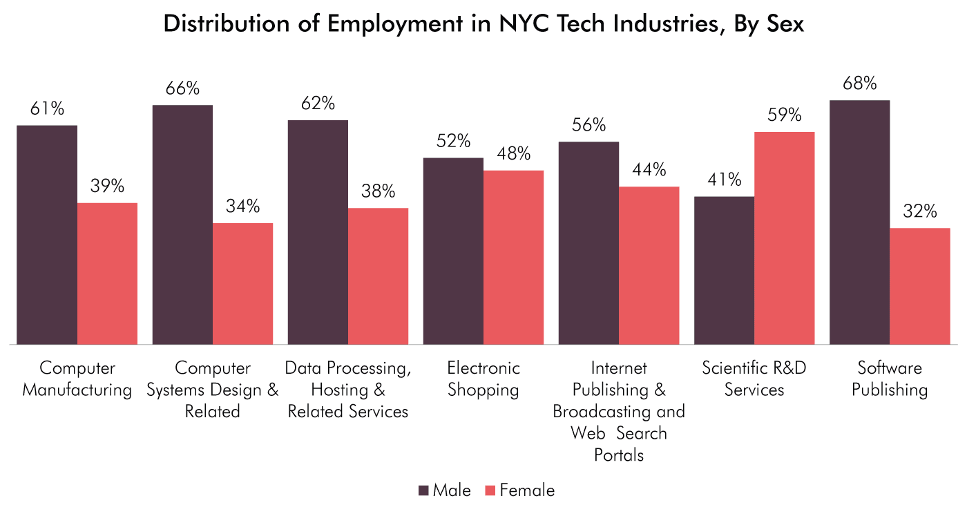 60 percent of tech sector employees are male, with the highest percentages of male employees found in Software Publishing (68 percent), Computer Systems Design (66 percent), Data Processing & Hosting (62 percent) and Computer Manufacturing (61 percent). The subsectors with the highest ratio of female employees are Scientific R&D Services (59 percent female), Electronic Shopping (48 percent) and Internet Publishing & Web Search Portals (44 percent).