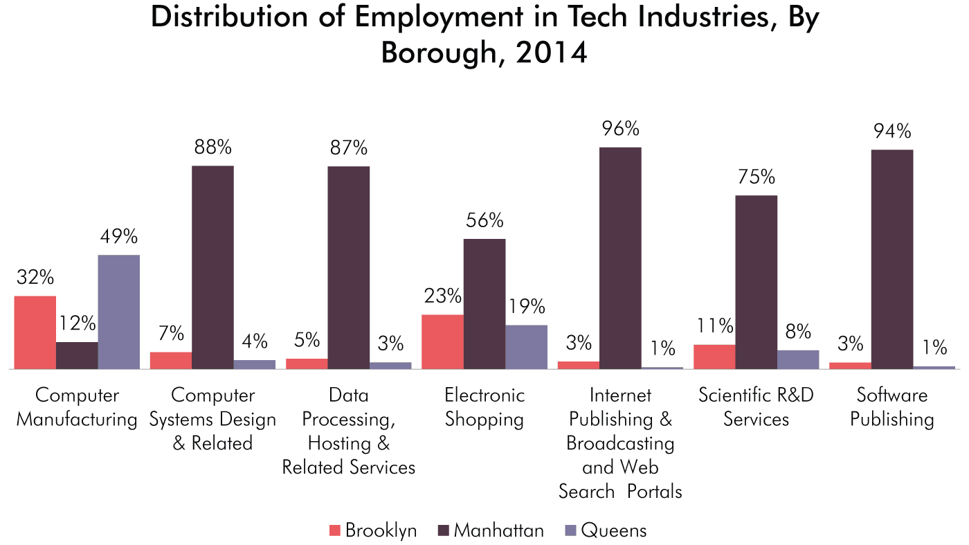 Manhattan accounts for 96 percent of the city’s jobs in Internet Publishing & Web Search Portals, 94 percent in Software Publishing, 88 percent in Computer Systems Design, 87 percent in Data Processing & Hosting, 75 percent in Scientific R&D Services, 56 percent in Electronic Shopping and 12 percent in Computer Manufacturing. Brooklyn is home to 32 percent of jobs in Computer Manufacturing and 23 percent in Electronic Shopping. Queens is home to 49 percent of jobs in Computer Manufacturing and 19 percent in Electronic Shopping.