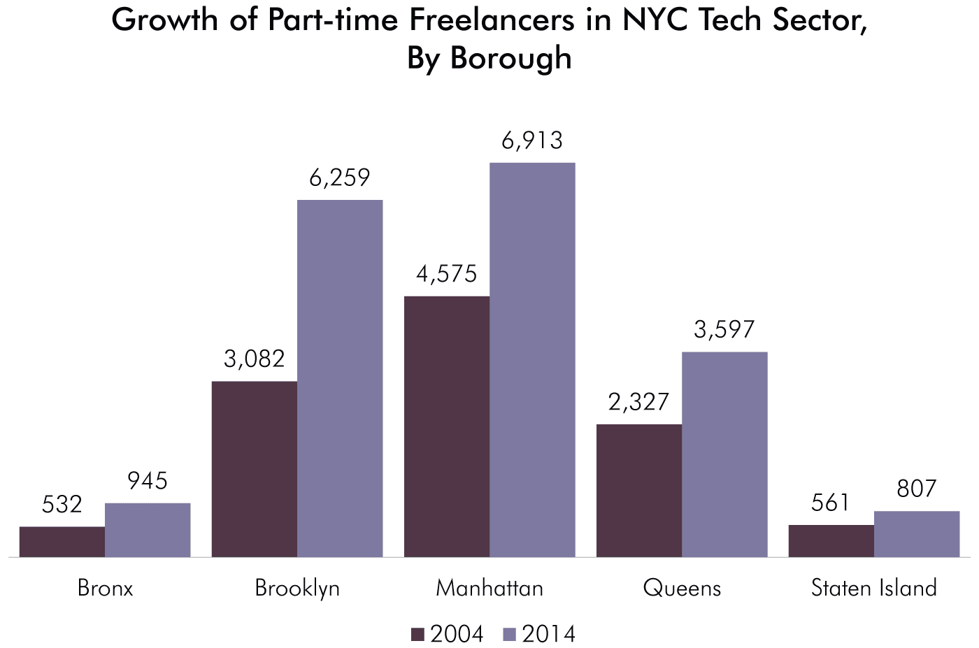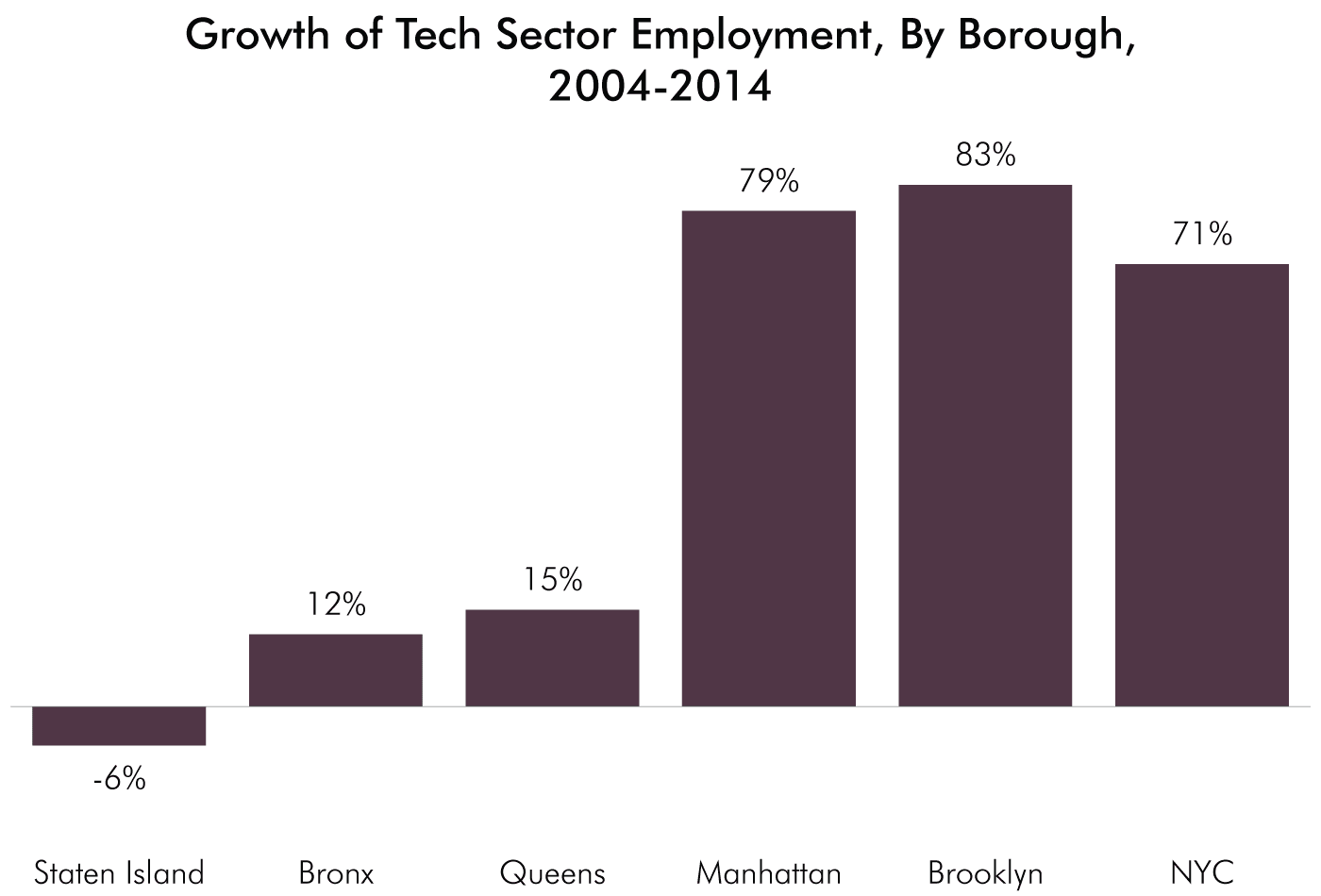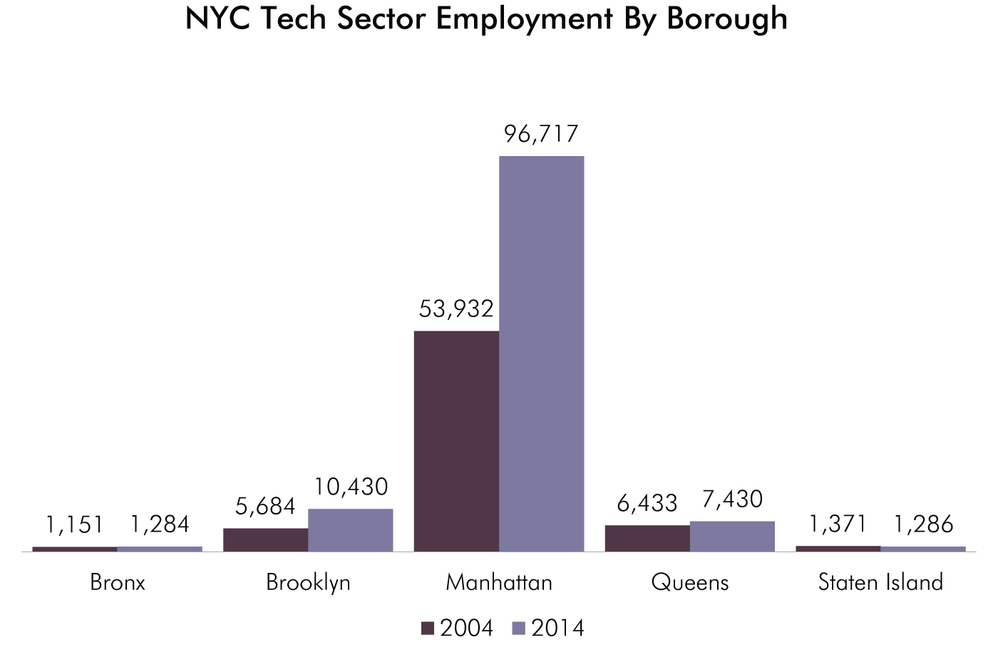 Brooklyn had the fastest growth in tech sector of any borough, with the number of jobs increasing by 83 percent (from 5,684 to 10,430). The tech sector grew by 79 percent in Manhattan (53,932 to 96,717), 15 percent in Queens (6,433 to 7,430) and 12 percent in the Bronx (1,151 to 1,284). Tech sector employment decreased by 6 percent in Staten Island (1,371 to 1,286).