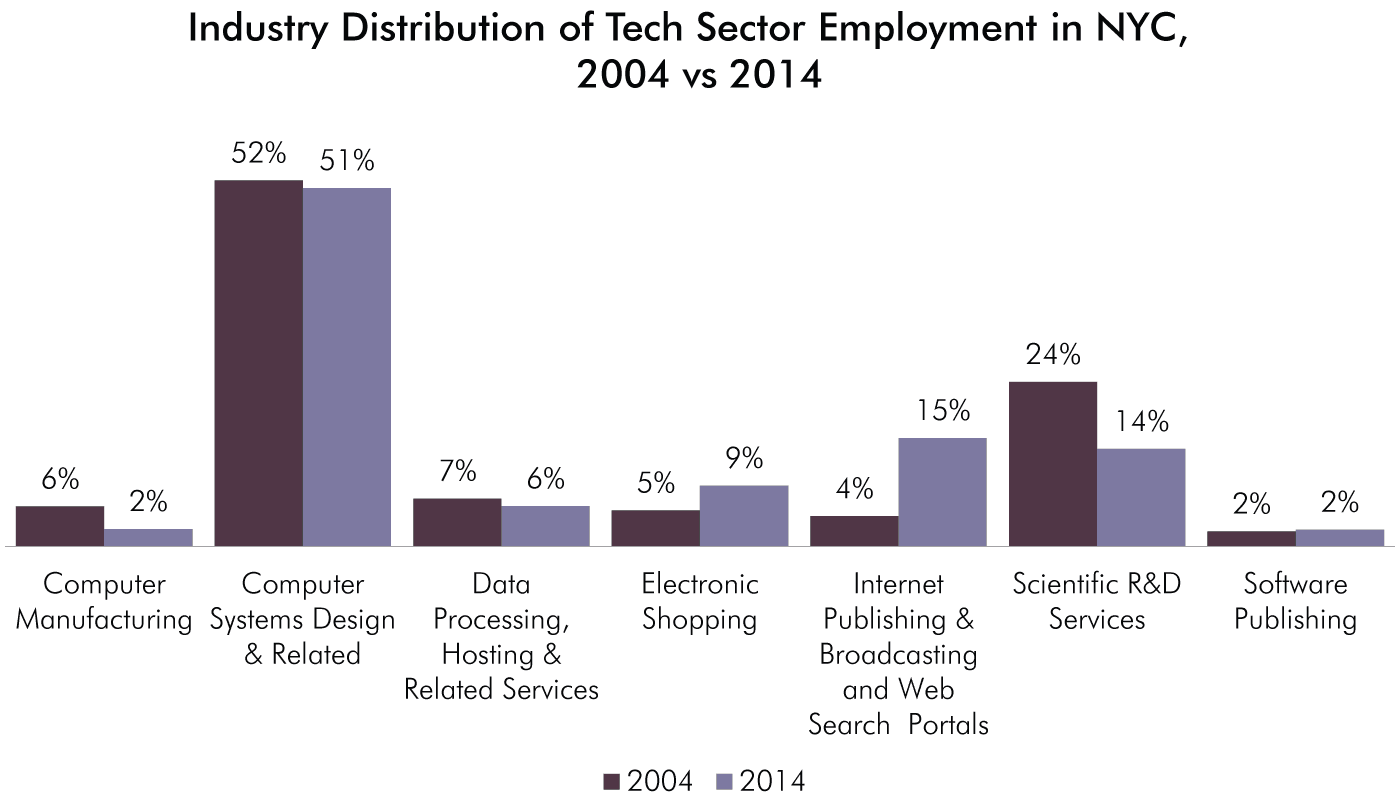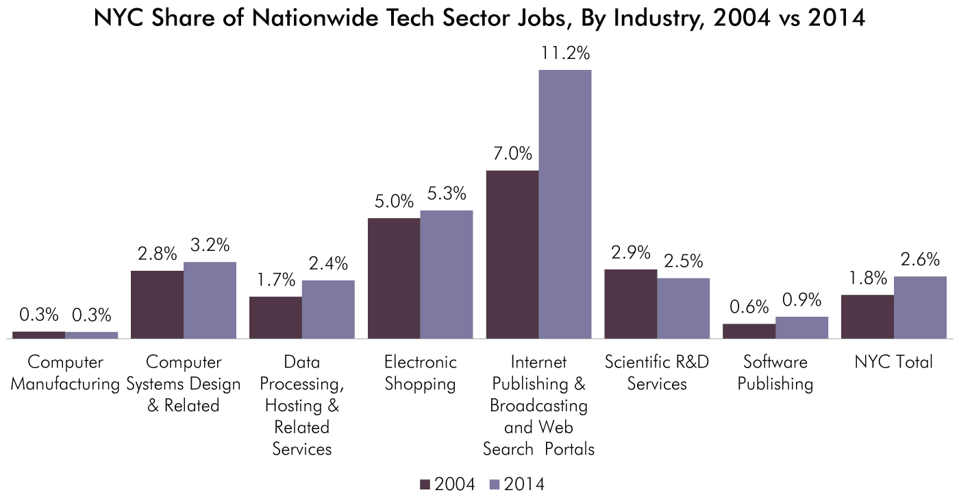 In 2014, 2.6 percent of the nation’s tech sector jobs were located in New York City, up from 1.8 percent in 2004. The concentration of jobs located in New York rose in each of the seven tech subsectors, except for Scientific R&D Services. From 2004 to 2014, the share of the nation’s job in Internet Publishing & Broadcasting and Web Search Portals industry rose from 7 percent to 11.2 percent. As of 2014, 5.3 percent of the nation’s jobs in Electronic Shopping and 3.2 percent of jobs in Computer Systems Design were located in the city.