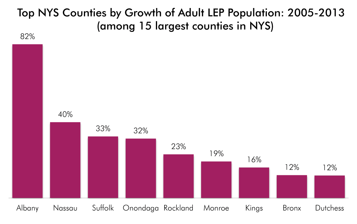 The number of individuals with limited English proficiency (LEP) increased by at least 20 percent in five counties between 2005 and 2013: Albany (which registered an 82 percent increase), Nassau (40 percent), Suffolk (33 percent), Onondaga (32 percent), and Rockland (23 percent).