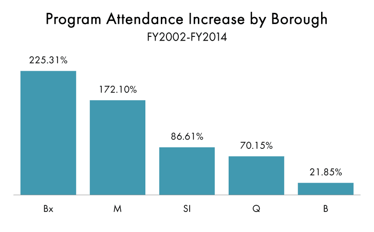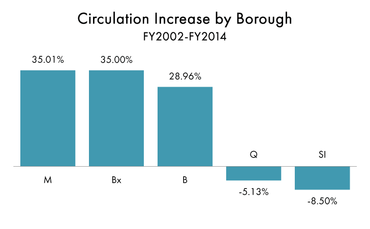 Whether it is program attendance or circulation, no borough has seen bigger increases over this period than the Bronx. Between 2002 and 2014, libraries in the Bronx experienced a 225 percent increase in attendees at public programs, while Manhattan libraries jumped 172 percent, Staten Island branches 87 percent, Queens branches 70 percent, and Brooklyn branches 22 percent over the same period. Since 2002, branches in both Manhattan and the Bronx have experienced a 35 percent rise in circulation, while Brooklyn libraries saw a 29 percent rise. Circulation dropped in Queens (-5 percent) and Staten Island (-9 percent) over this period.