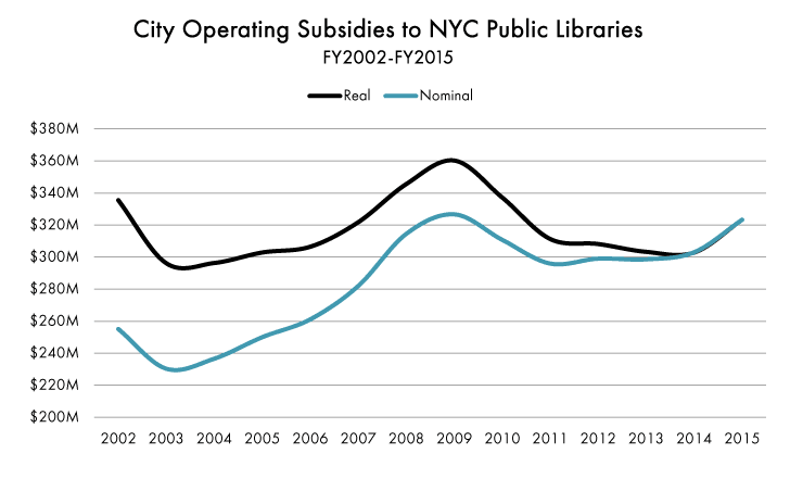 Funding cuts after the September 11th terrorist attacks and then again after a full restoration of six-day service in 2008 caused the libraries to reduce staff and service hours and cut way back on the purchase of new materials. Since Fiscal Year 2009, when the libraries received over $360 million in subsidies (inflation adjusted), a bump due in small part to retroactive payments to unionized staff, funding has dropped 10 percent. And although program attendance figures have continued to rise over that period, circulation has dropped significantly. After reaching a peak of 69 million materials in 2011, circulation dropped 18 percent to 56 million materials in 2014.