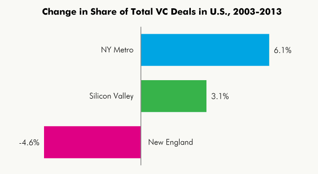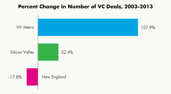 Source: Center for an Urban Future analysis of data from MoneyTree Report, published by PricewaterhouseCoopers and the National Venture Capital Association with data from Thomson Reuters