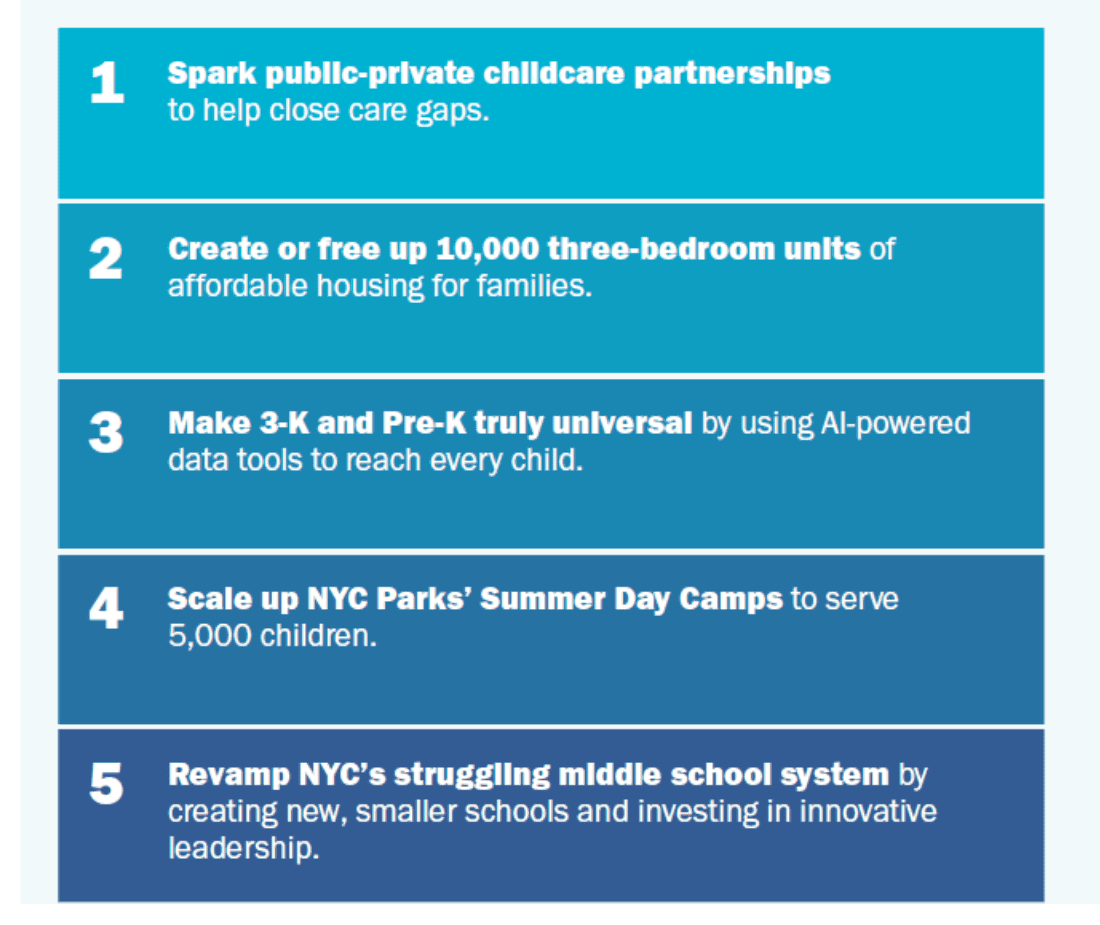 This report aims to fill that gap, laying out five innovative but extremely actionable ideas to help New York City retain—and attract—families. Our five concrete proposals could all be launched this year or in the next few years and, if implemented, would each make a tangible difference in making New York more affordable and more attractive to families.