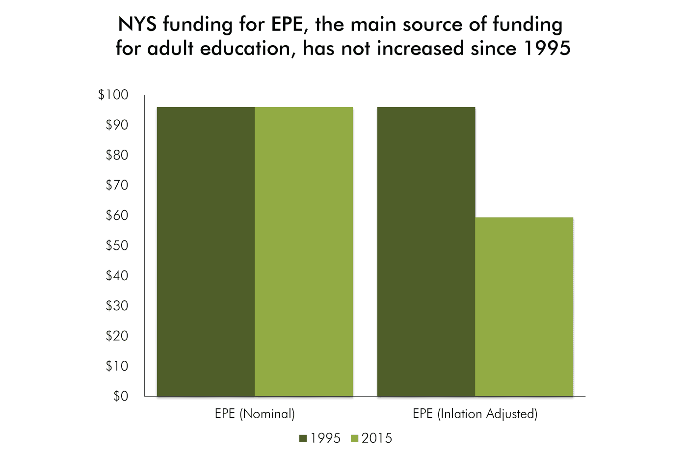 The largest funding source for adult education in New York State is a program called Employment Preparation Education, or EPE, which was allocated a funding source of $96 million in 1995—generous at the time, compared to most other states. Incredibly enough, however, funding for EPE remains at $96 million in 2015, even as inflation has driven up prices for the economy as a whole by roughly 55 percent during this time and the number of New Yorkers who could benefit from adult education programs, including English language programs, has increased dramatically. (For instance, between 2005 and 2013, the state’s foreign-born population increased by nearly 400,000 and the number of immigrants needing English instruction jumped by 14 percent. During the same period, the number of state-funded seats for English instruction fell by 32 percent.) Today, New York ranks only 18th among all states in its per-adult funding for adult education.2
