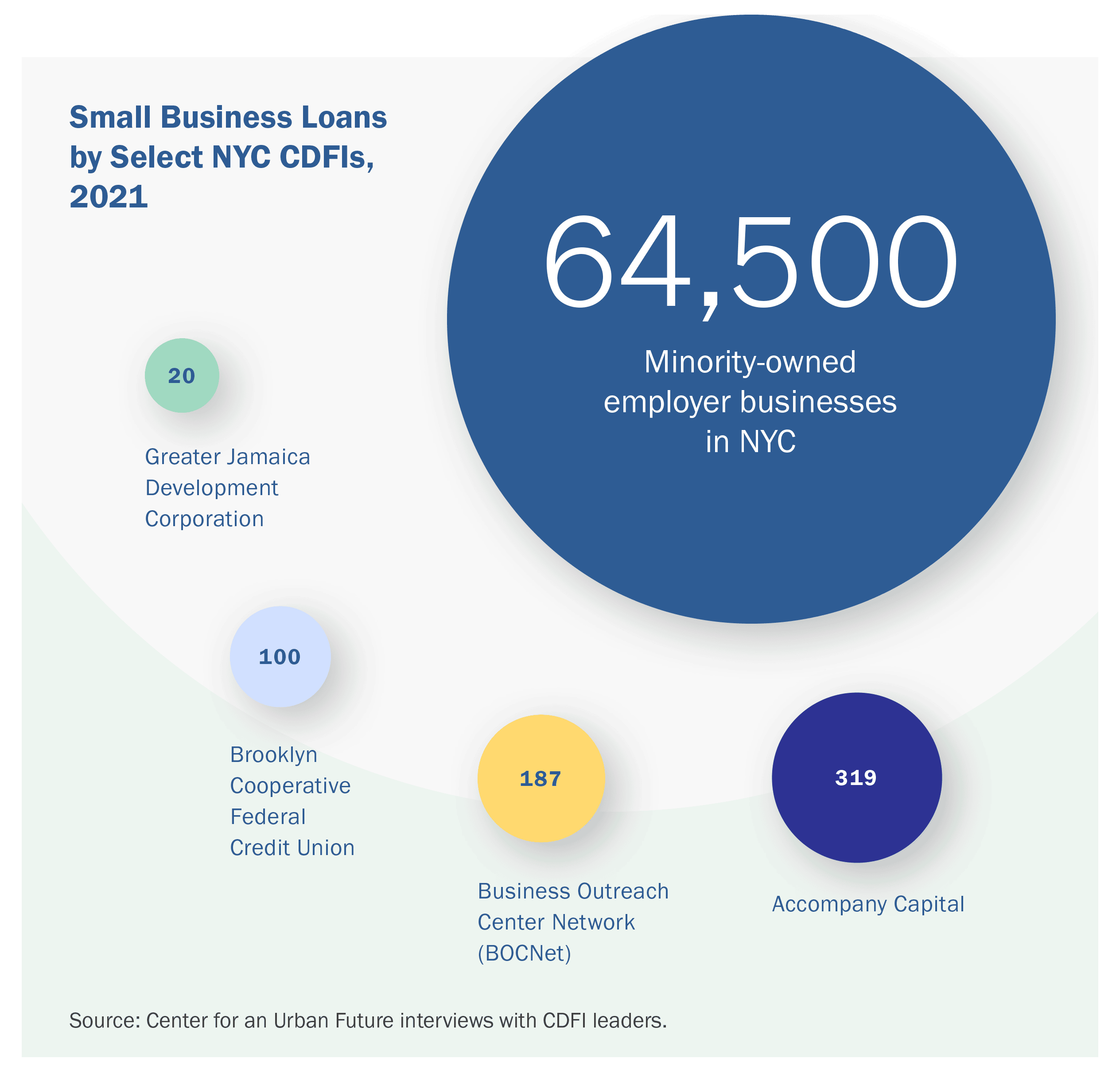 The problem is that CDFIs serve only a tiny fraction of the businesses and aspiring entrepreneurs who could benefit from affordable loans and business advising services. Our research shows that most nonprofit CDFIs in the city make no more than a few hundred loans each year, with some CDFIs closing less than two dozen. This is a drop in the bucket—and a striking missed opportunity in a city that’s home to more than 64,500 minority- owned employer businesses and tens of thousands more microentrepreneurs, the majority of whom face enormous difficulty accessing capital.1