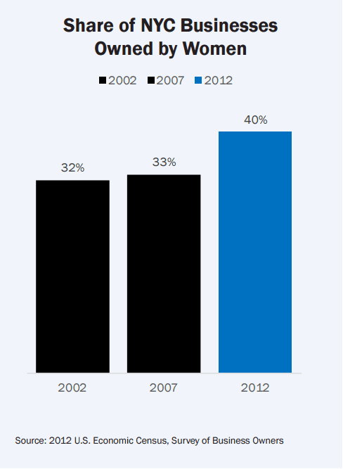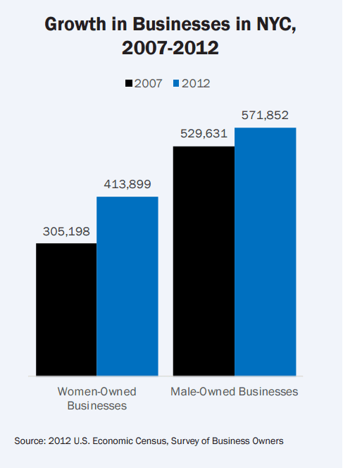 What’s clear from our research is that women entrepreneurs in New York have come a long way in recent years. More than 62 percent (163,000) of the 262,000 new private companies formed in the city between 2002 and 2012 are women-owned. All told, in 2012, women-owned businesses in the city generated $53 billion in revenue, up 25 percent over 2007, employed nearly 273,000 people, 36 percent more than in 2007. Amazingly, in 2012 New York City accounted for 57 percent of all women-owned businesses in New York State, which is much higher than the city’s overall share of the state’s businesses and population.