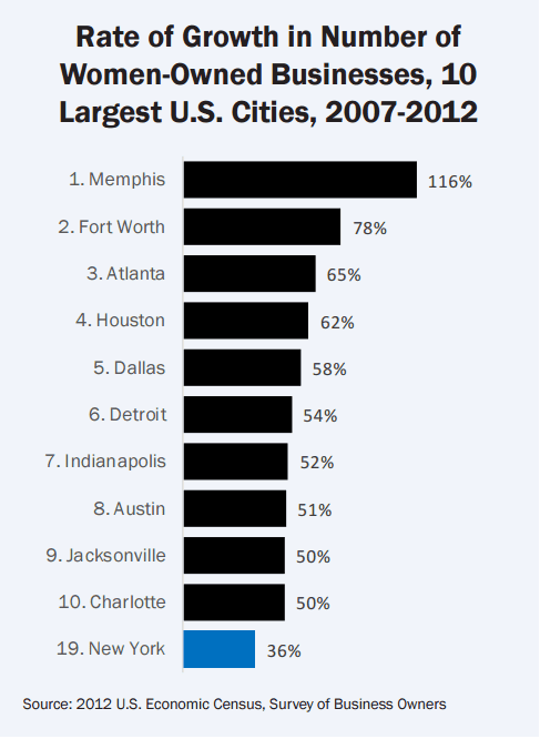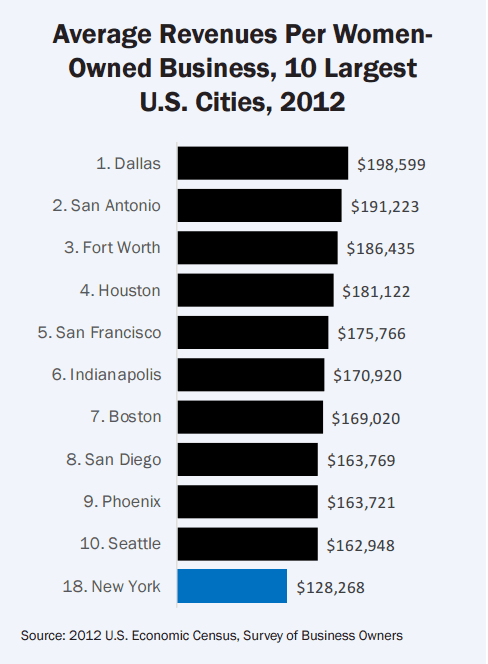 When compared with other major cities around the country, New York has more women- owned businesses by far: 413,899, and more than double the next nearest competitor, Los Angeles (192,358). Yet, the ranks of women entrepreneurs here are growing more slowly and they are delivering less economic impact than sister businesses in other cities. According to the 2012 U.S. Census, New York City ranks 19th among the 25 most populous cities in the growth of women-owned firms between 2007 and 2012, 18th in average sales and seventh in the average number of people they employ. The average women-owned business in New York City has sales of $128,268, much lower than female-owned firms in Dallas ($198,599), Houston ($181,122), San Francisco ($175,766), Boston ($169,020), Seattle ($162,948), Washington, DC ($162,495), Los Angeles ($142,378) and several other large cities.