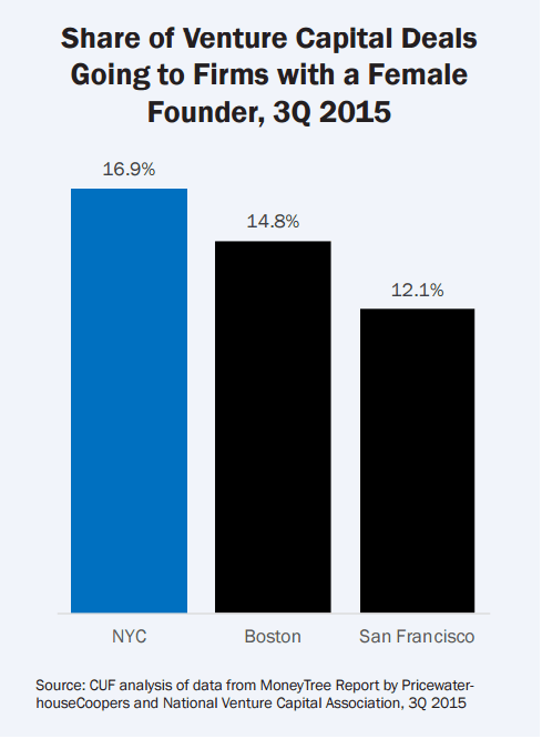 Even in the tech sector, where it has become cheaper and easier to start a company, women entrepreneurs attract less money. Our analysis of the MoneyTree report, a quarterly study of the nation’s venture capital deals published by PricewaterhouseCoopers and the National Venture Capital Association, reveals that while 16.9 percent of New York City companies receiving VC funds in the third quarter of 2015 had a female founder, companies with a female founder accounted for just 8.7 percent of the total VC funds received that quarter—$122 million out of $1.41 billion. That’s a smaller percentage than San Francisco, where women founded companies accounted for 9.0 percent of total VC funds raised in that quarter ($293.5 million out of $3.27 billion) and Boston, where women-founded companies accounted for 21.8 percent of all VC funds raised in the quarter ($138.4 million out of $634.5 million).
