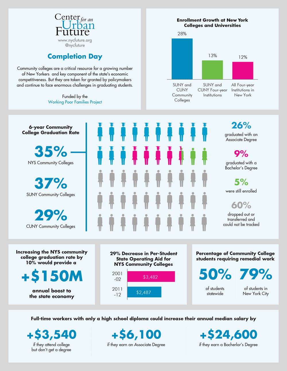 This report details the increasing importance of community colleges to New York State’s economy and documents why raising graduation rates at the state’s community colleges by even a small amount would result in significant benefits to the state’s employers, young adults and the working poor. A follow-up to our 2011 Mobility Makers study, which focused on the importance of improving the graduation rate at the six community colleges in New York City, this report details graduation rates for all 35 community colleges statewide and focuses mainly on SUNY community colleges across the state. Funded by the Working Poor Families Project—a national initiative supported by the Annie E. Casey, Ford, Joyce and Kresge Foundations, which partners with nonprofit organizations to strengthen economic conditions and state policies affecting working families—the report is based on extensive data analysis and more than two dozen interviews with community college leaders, education experts and employers from nearly every region around the state.