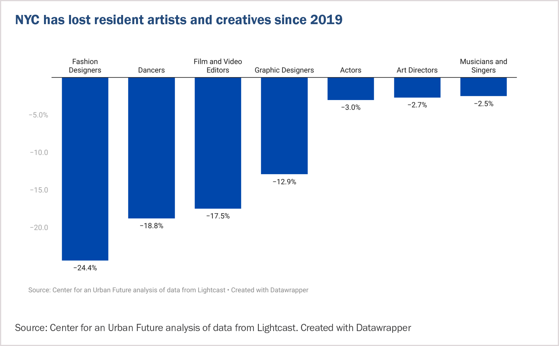 But after decades of steady growth in almost every part of the city’s creative economy, this vital engine is now sputtering. Since the start of the pandemic, the city has seen an 18.8 percent decline in dancers, an 8 percent drop in actors, and a 2.8 percent decrease in musicians. But it’s no longer just artists whose numbers are dwindling: fashion designers are down 28.9 percent, film and video editors 18.5 percent, graphic designers 13.8 percent, and art directors 6 percent.1