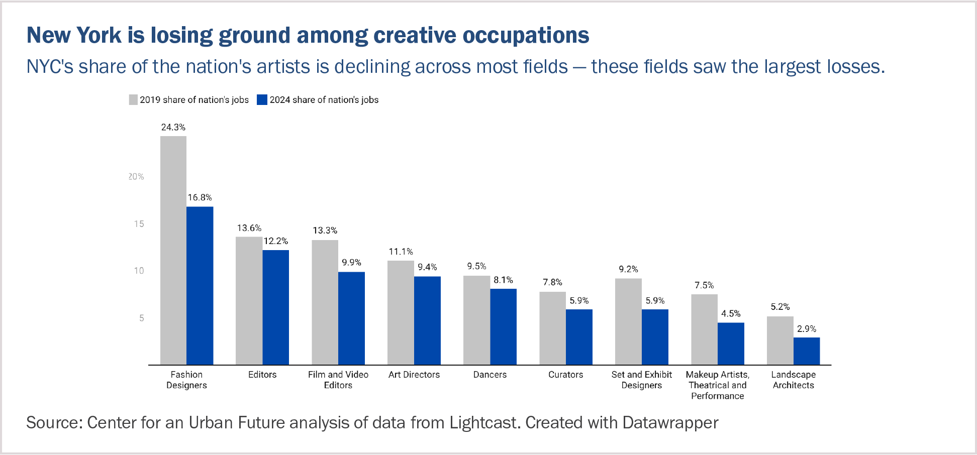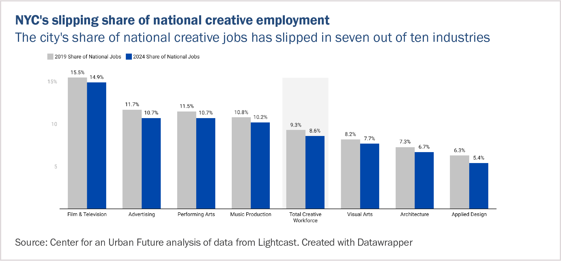 declines in the city’s share of national employment in advertising (from 11.7 percent of the nation’s jobs in 2019 to 10.7 in 2024), performing arts (11.5 percent to 10.7 percent), applied design (6.3 percent to 5.4 percent), film