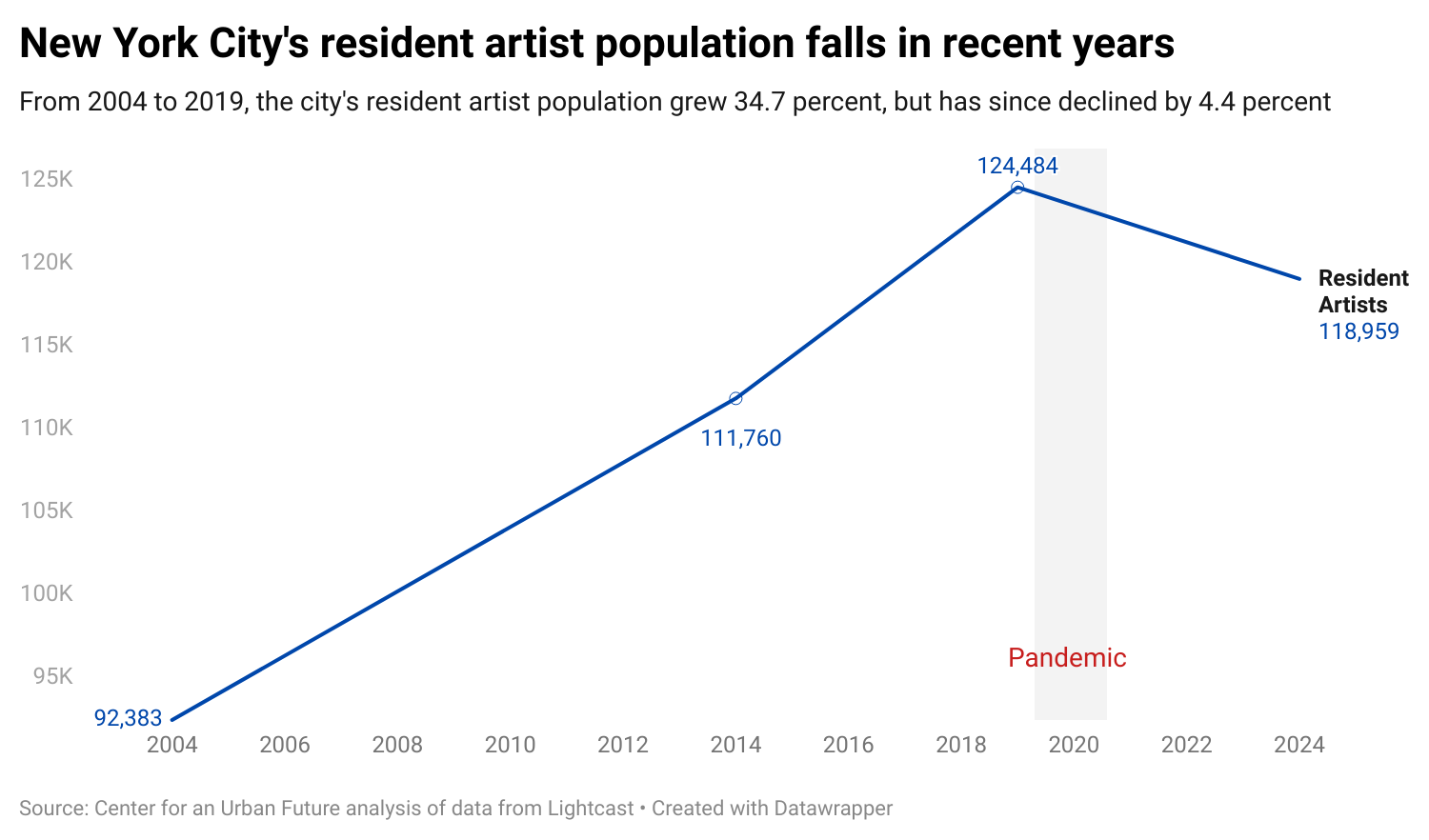 Many assume New York has been losing artists and creatives for decades, but resident worker data reveals the real decline began only in the past five years. Between 2004 and 2019, the city’s resident artist population increased by 34.7 percent—from 92,383 in 2004 to 111,760 in 2014 and 124,484 in 2019. But from 2019 to 2024, the city’s artist population has declined by 4.4 percent (to 118,959).
