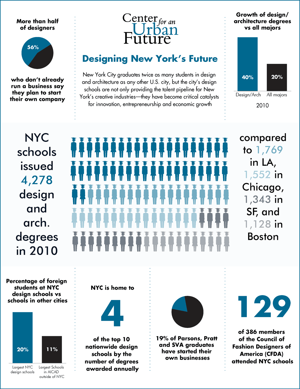 Thus far, the “innovation economy” initiatives advanced by city and state officials have largely overlooked design universities. This is a missed opportunity in a city that is arguably more of a creative hub than a high-tech center. As this report demonstrates, New York’s design universities are already a key piece of the city’s innovation infrastructure. But at a time when designers are having a growing influence on everything from smart phones to the delivery of health care services, these institutions are poised to play an even more central role in New York’s economic future.