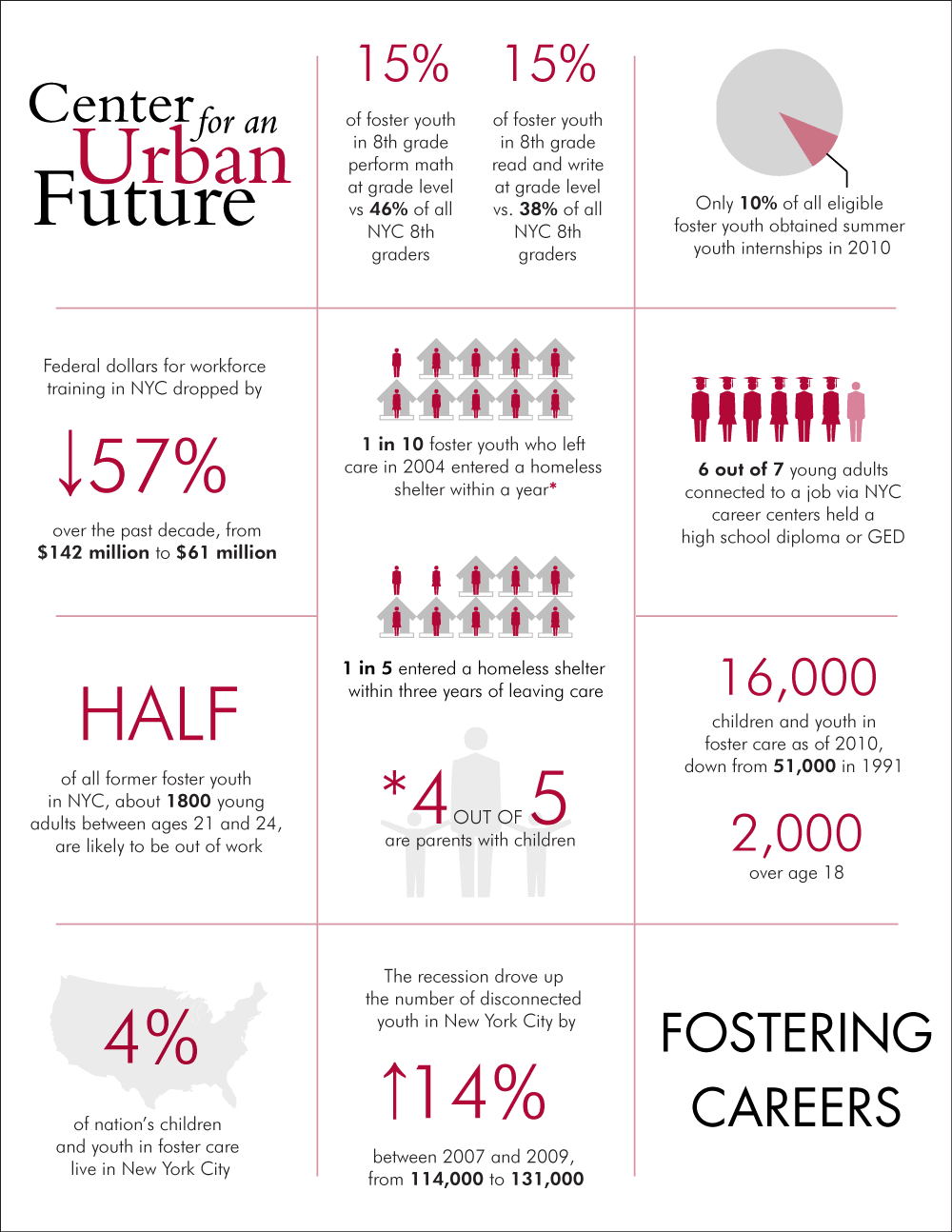 Most of these “disconnected” young people have never gone through New York’s foster care system. However, experts who study disconnected youth have found that teenagers in foster care are much more likely to disconnect from school and work than other youth. Indeed, foster youth are greatly over-represented in every adult population that is considered dysfunctional—prison, welfare, homeless shelters.