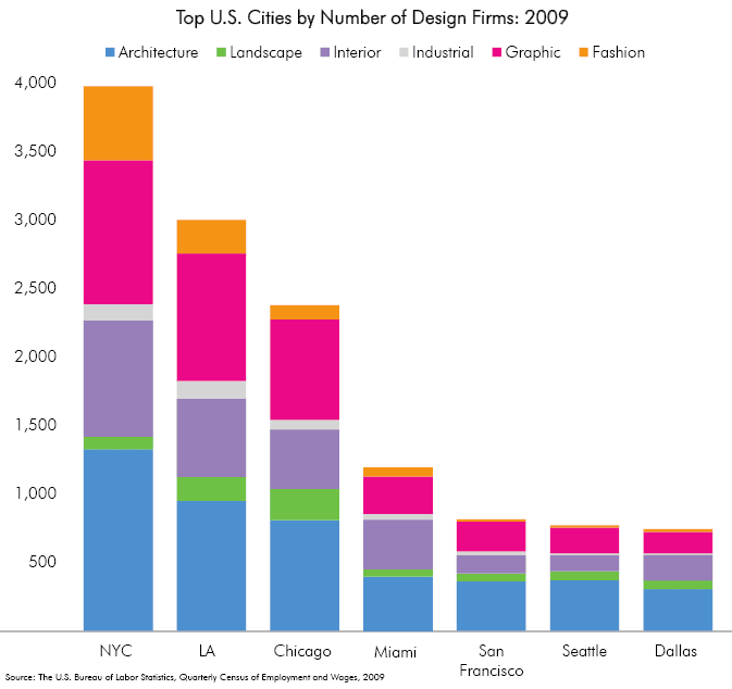 No other city in the country has as many leading firms in architecture, landscape architecture, fashion design, interior design, and graphic design. In 2009, for instance, the five boroughs of New York had 40 percent more architectural firms than the next closest U.S. city (Los Angeles) and two thirds as many as the third closest (Chicago). In Architectural Record’s annual list of top architecture firms by revenue, New York had more high grossing companies than any other U.S. city in the last five years. In 2010, New York had 18 firms in the top 250, while Chicago had 12 firms, Houston 11, Atlanta 9, and San Francisco 7. And that’s just measuring firms that are headquartered here; many of the largest firms that are based elsewhere have major offices here; for instance, Gensler, the number 2 firm on the list, is based in San Francisco but has its largest office in New York.
