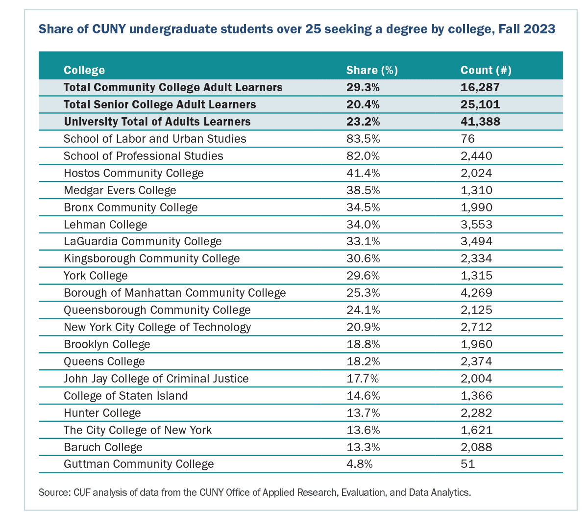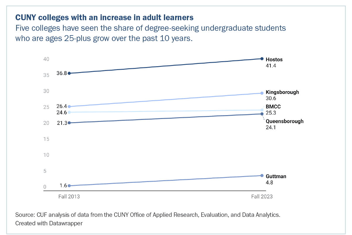Even as overall enrollment has declined at CUNY over the past decade, the number of older students has held relatively steady. As a result, adult learners now comprise a growing share of all undergraduates at 5 out of 7 community colleges: Kingsborough Community College (from 26.4 percent in 2013 to 30.6 percent in 2023); Hostos Community College (from 36.8 percent to 41.4 percent); Queensborough Community College (from 21.3 percent to 24.1 percent); Borough of Manhattan Community College (BMCC) (from 24.6 percent to 25.3 percent); and Guttman Community College (from 1.6 percent to 4.8 percent). Adult learners comprise over one-third of the undergraduate population at seven colleges, including Hostos (41.4 percent); Medgar Evers College (38.5 percent) Lehman College (34 percent); LaGuardia (33.1 percent); Bronx Community College (34.5 percent), as well as the CUNY School of Professional Studies (82 percent) and the CUNY School of Labor and Urban Studies (83.5 percent).7