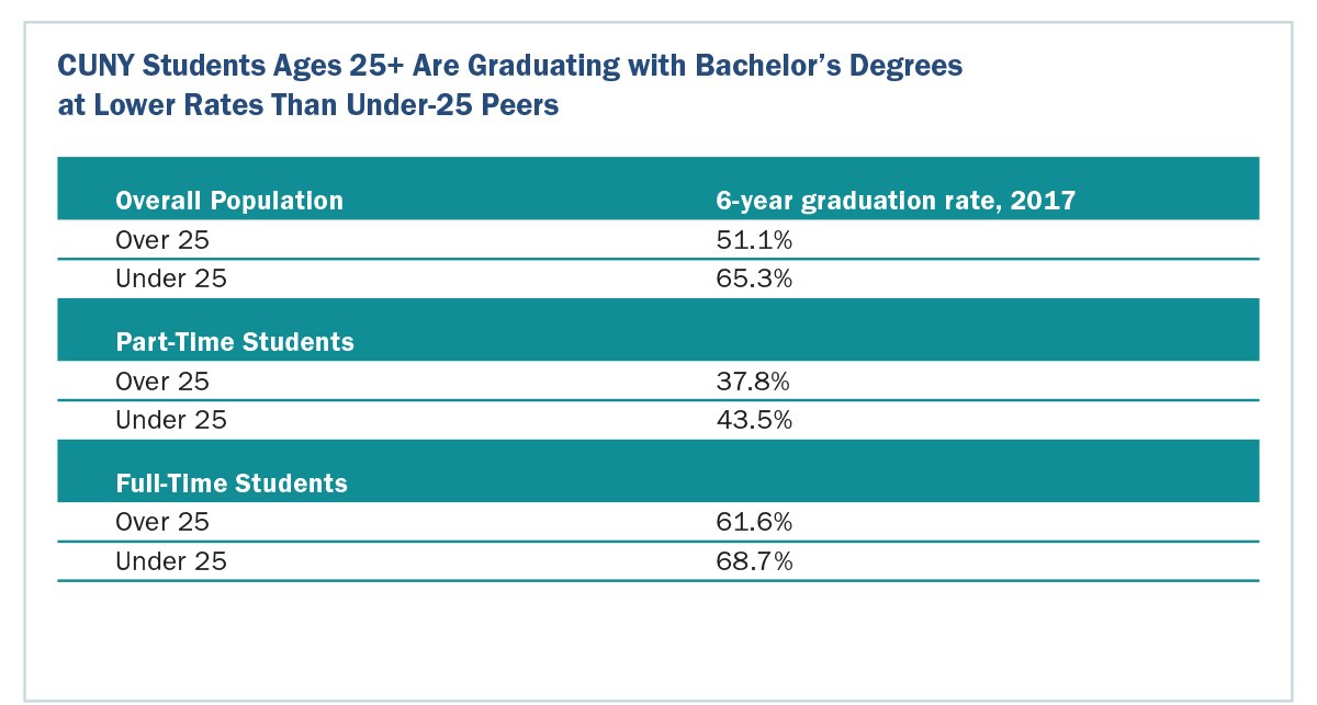 Retention and graduation rates for many of CUNY’s adult learners are lower than for under-25 peers.