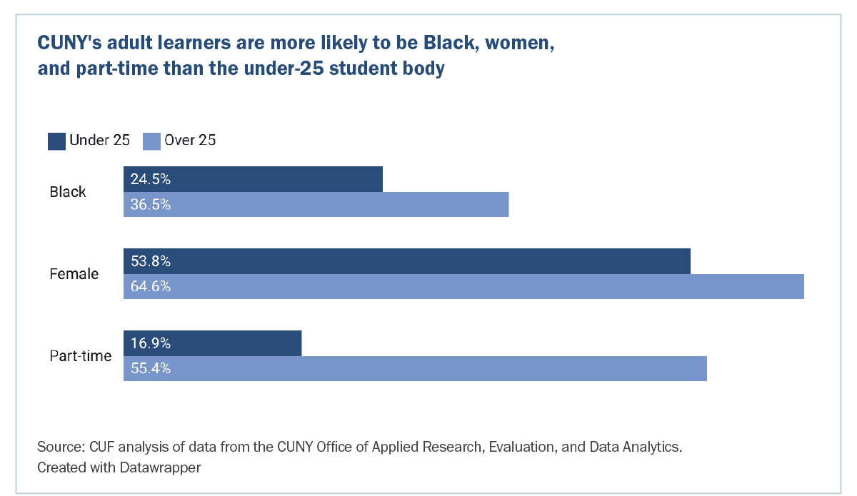Today, nearly one-quarter (23 percent) of all degree-seeking undergraduate students at CUNY are adult learners—students over the age of 25. These students are juggling an outsized share of family and work responsibilities compared to the traditional 18-year-old freshman. They are much more likely to be among the 31 percent of all working CUNY students who have full-time jobs, and among the 13 percent of all students who are financially supporting children—including one in six community college students.1 And adult learners at CUNY are more likely to be Black and/or women than are students under 25.