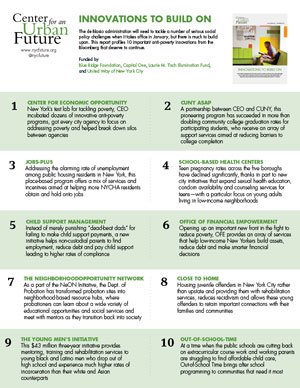 The policy successes that we outline in this report should not be seen as a list of accomplishments alone, but a foundation to build upon. In more than a few cases, the programs we describe are but a first step in the right direction. A number of them—like Out of School Time—have been compromised by insufficient funding and deserve to be expanded, while others—like the Young Men’s Initiative—show exceptional promise but have yet to prove themselves. For instance, while speaking about one of the 10 initiatives we highlight in this report, one nonprofit leader notes, “One agency withdrew from the program because they were losing money, even though they thought it was a wonderful program and well within their mission.”