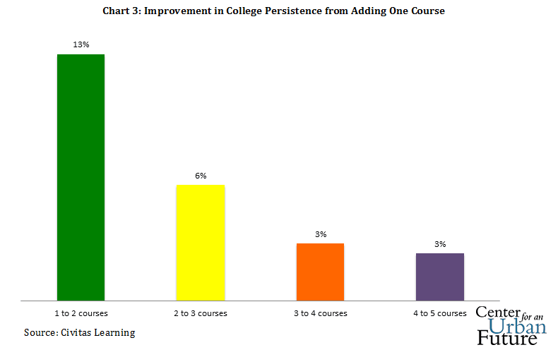 Students unquestionably benefit from taking more courses and reducing time to degree. But there’s nothing magical about taking 15 credits a semester. A more effective approach would be to encourage all students to take at least one more class and then support them. One recent study found that college persistence improves when students increase their course load, with the biggest gains at the low end.10 Students who increased their course load from one course to two experienced a 13 percentage-point gain in persistence, while those who increased their course load from four to five courses gained just under three percent. See chart 3.