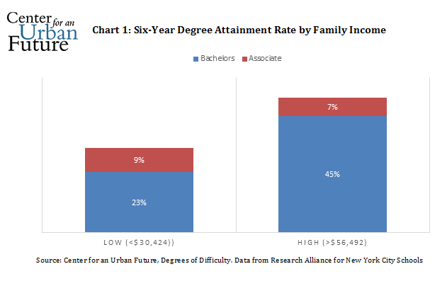 Low-income students might appear to be taken care of already, since they receive (or are at least eligible to receive) Pell and TAP grants. Yet our study found that low-income high school graduates in New York City are only half as likely to obtain a bachelor’s degree as higher-income students. See Chart Two. Financial barriers other than tuition continue to drive them out of college at staggeringly high rates. Seven out of ten CUNY community college students come from households earning less than $30,000 a year, and half of those households earn less than $20,000. Students we interviewed said over and over again that the cost of transportation to classes constantly undermined their attendance and focus. The CUNY ASAP program has doubled the three-year graduation rate among community college students in part by covering the cost of transportation and books, in addition to tuition.