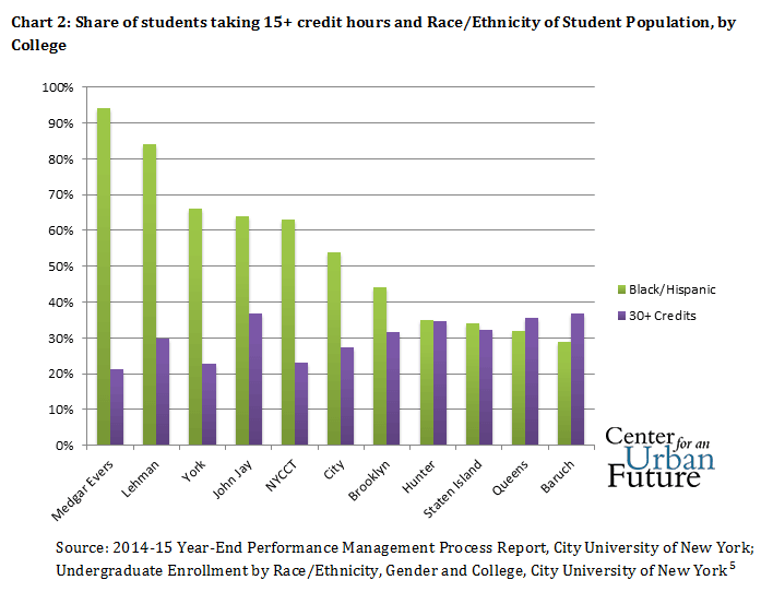 The 15-credit-hour standard is unattainable to students who work, care for children, or have to take developmental courses. At CUNY, more than half (53 percent) of community college students work while attending school, and one out of six support children financially. Those students are more likely to be disadvantaged, and in particular are more likely to be black or Hispanic. To illustrate this connection, consider the relationship between race/ethnicity and taking 15 credits or more per semester at CUNY senior colleges. The college with the lowest rate of 15+ course-taking is Medgar Evers, where 94 percent of students are black or Hispanic, while the college with the highest rate is Baruch College, where only 29 percent of students are black or Hispanic.