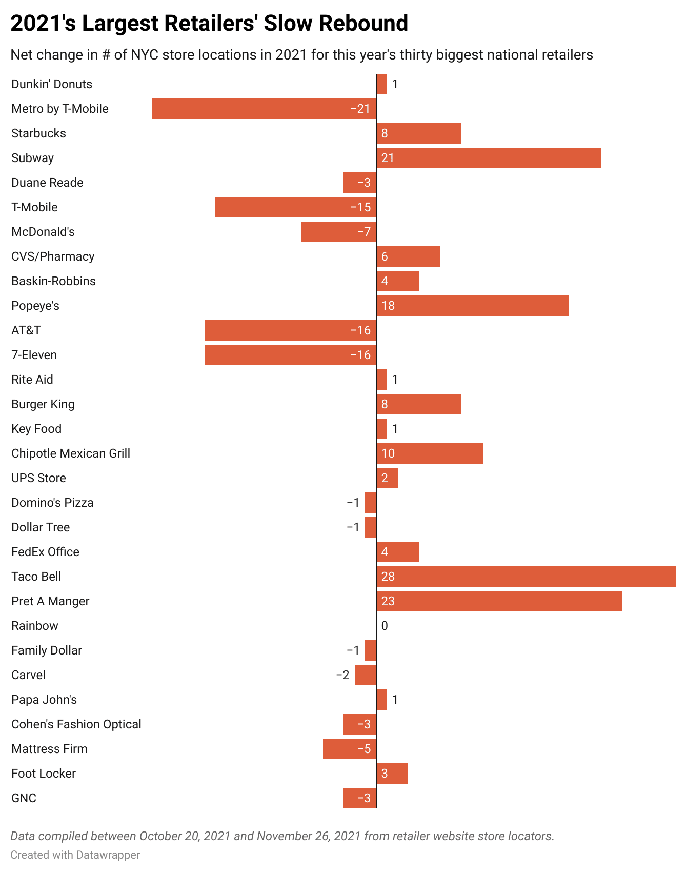 As the city moved toward recovery, some stores continued to log significant year-over-year declines of over 10 locations since the 2020 report, including: Metro by T-Mobile (-21), 7-Eleven (-16), AT&T (-16), T-Mobile (-15), and GameStop (-12).