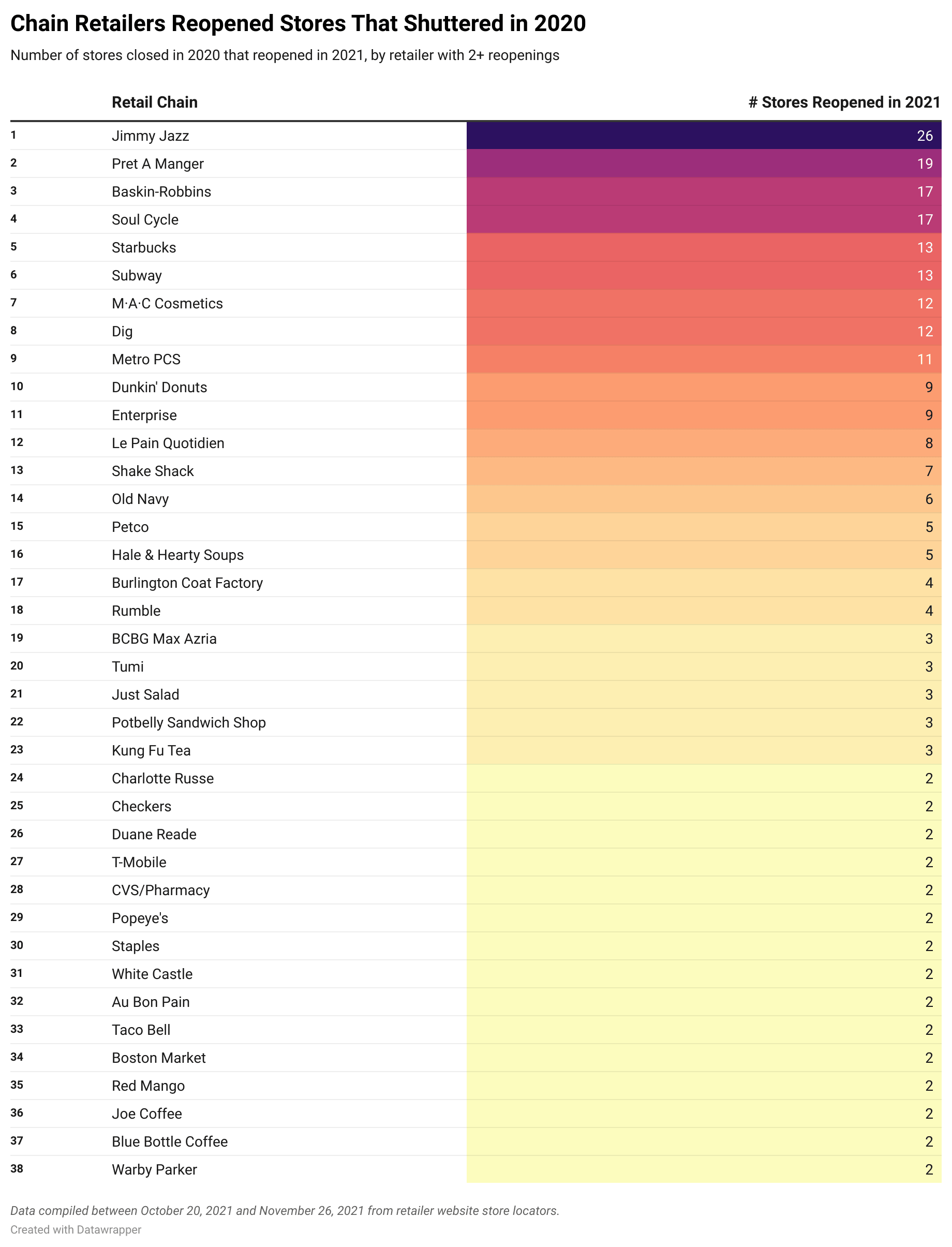 In last year’s analysis, we noted that many retailers reported significant numbers of temporary closures. This year, 260 of these store locations reopened their doors after closing in 2020. Leading the pack with 10-plus re-openings: Jimmy Jazz reopened 26 store locations; Pret A Manger reopened 19 locations, Soul Cycle reopened 17 locations; Baskin-Robbins reopened 17 locations; Starbucks reopened 13 locations; Subway reopened 13 locations; Dig (formerly Dig Inn) reopened 12 locations; MAC Cosmetics reopened 12 locations; and Metro by T-Mobile reopened 11 locations.