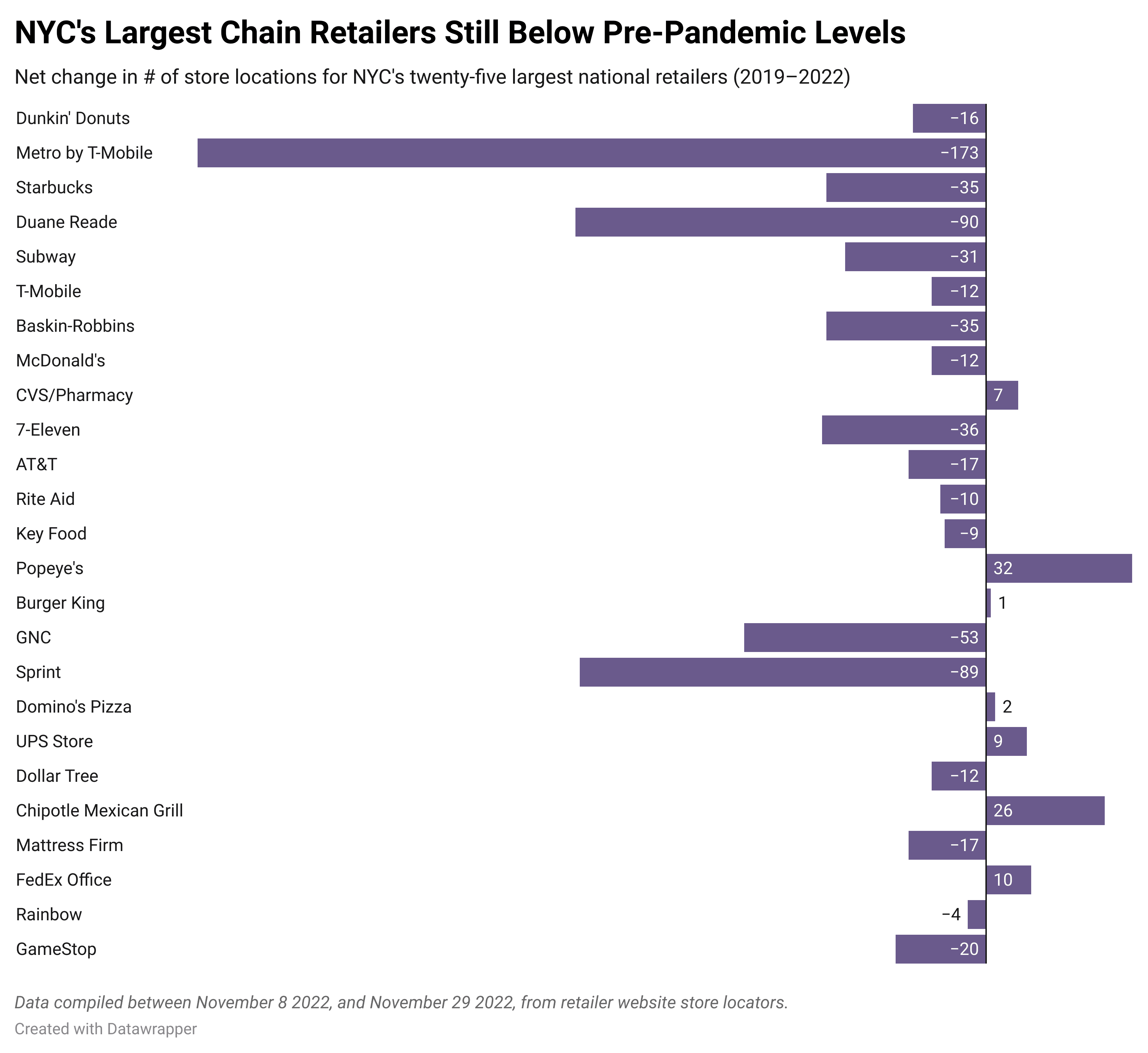 Three retailers closed all their remaining New York City stores since last year: department store Sears (-2), clothing and accessories store Strawberry (-1), and fast-casual restaurant chain Wichcraft (-1).