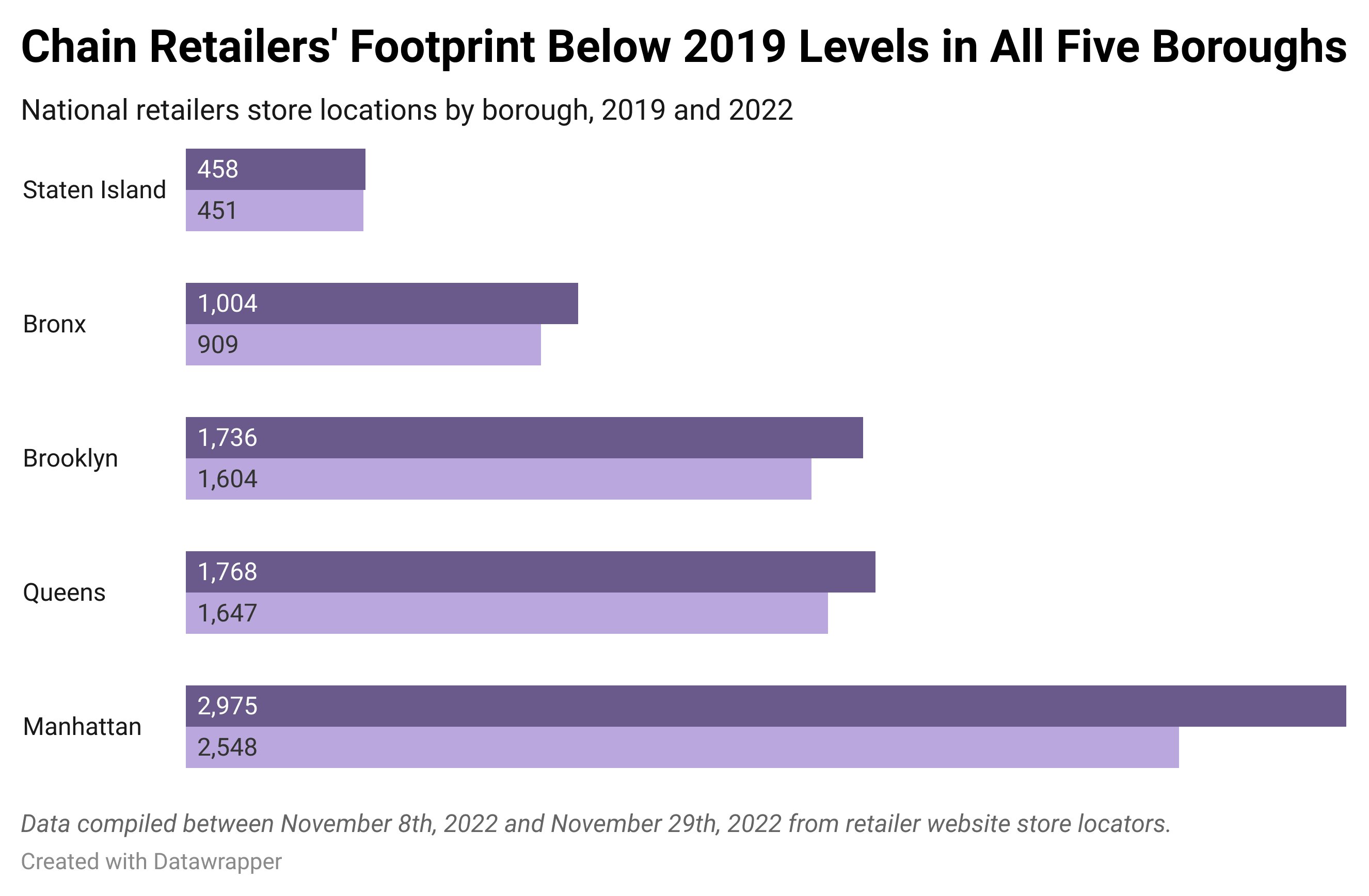 The Center for an Urban Future’s fifteenth annual report tracking chain retail trends in New York finds that 57 percent of the retailers that were featured in our 2019 State of the Chains report have fewer locations today than they did before the pandemic, including 11 percent who no longer have any stores here. Additionally, all eight of the city’s largest chain retailers have fewer locations today than they did in 2019.