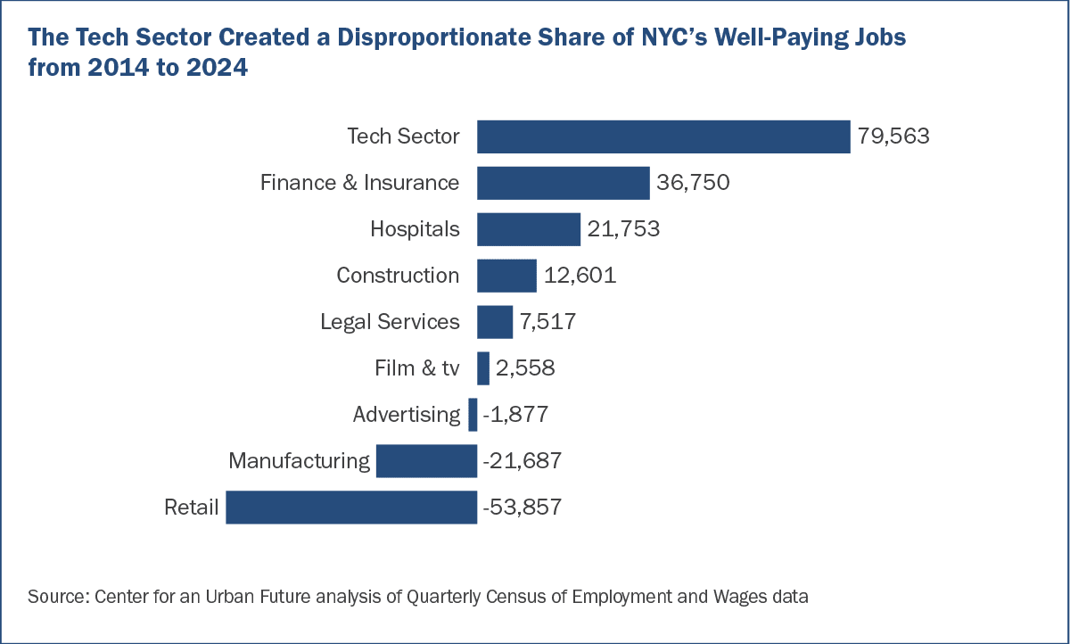 While the ingredients are in place for New York to maintain its momentum, create even more middle and high-wage jobs in tech, and expand access to tech-powered careers for more New Yorkers, this future is far from a given. The city faces more competition than ever from cities that have developed a critical mass of tech companies and are significantly more affordable than New York, including Austin, Miami, Raleigh, Atlanta, and Nashville. It’s easy to dismiss the threat from these smaller tech hubs—as well as those in Seattle, Boston, Washington, DC, and Chicago. But until a few years ago, no one would have believed that San Francisco, the biggest tech hub of them all, would bleed companies and talent, as happened between 2020 and 2023.