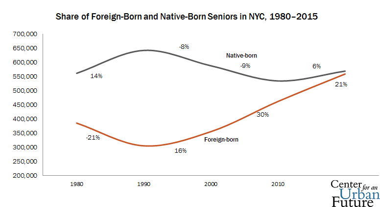 - As of 2015, 49.5 percent of New Yorkers ages 65 or older are foreign-born, up from 46 percent in 2010 and 38 percent in 2000.