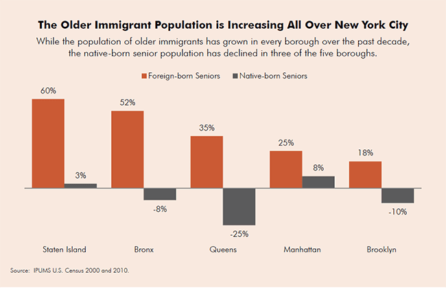 The total number of older immigrants in New York is also increasing rapidly. Over the last decade, as the native-born senior population decreased by 9 percent, the number of older Asian immigrants grew 68 percent, older Caribbeans 62 percent and older Latinos 58 percent. Overall, the number of foreign-born seniors jumped 30 percent in that time, going from 356,000 in 2000 to 463,000 ten years later.
